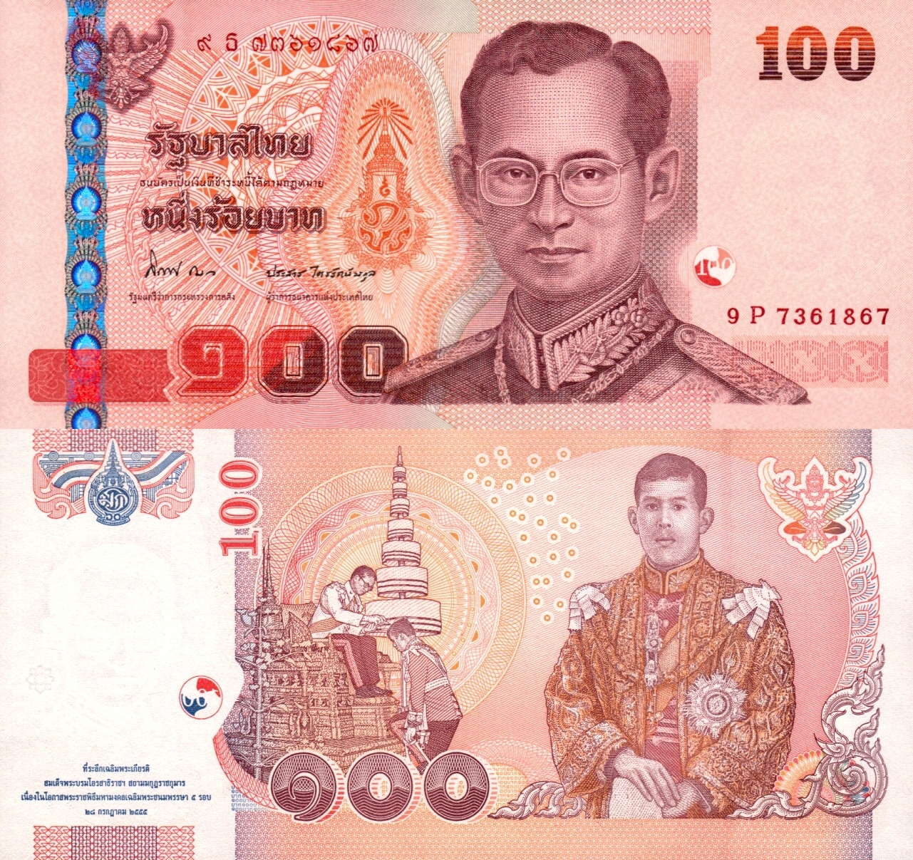 - Примітки: підписи та варіант із фото, пам’ятна банкнота з нагоди 60-річчя короля Маха