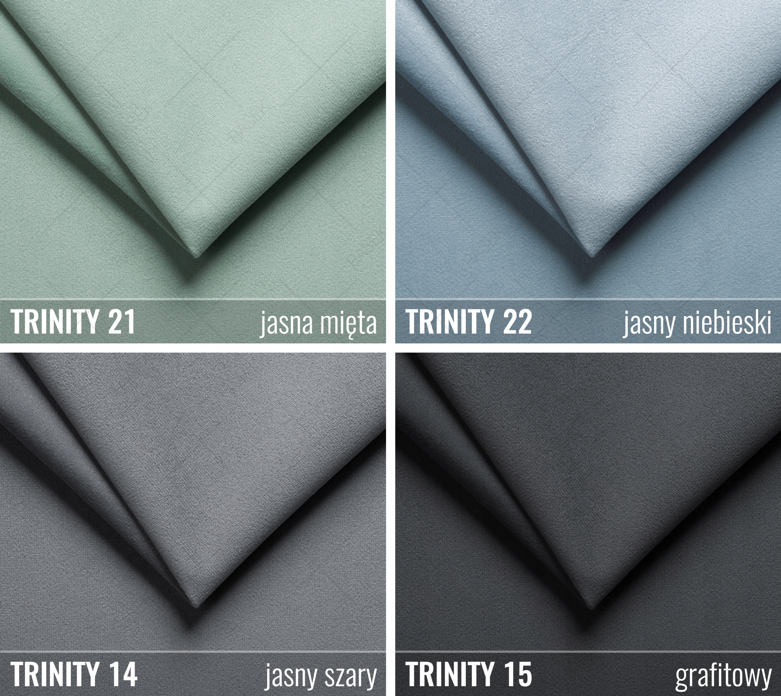 Тканина ТРИНІТІ - популярна велюрова оббивна тканина. Його характерна особливість - ніжна структура і поверхня, вкрита дрібним ворсом - м'яка і приємна на дотик. Користується популярністю завдяки тонкому відтінку матеріалу і матовим кольорам. Стійкий до стирання, пілінгу та світла! Тканина має обмежені властивості поглинання рідини, що позитивно впливає на її чистоту.