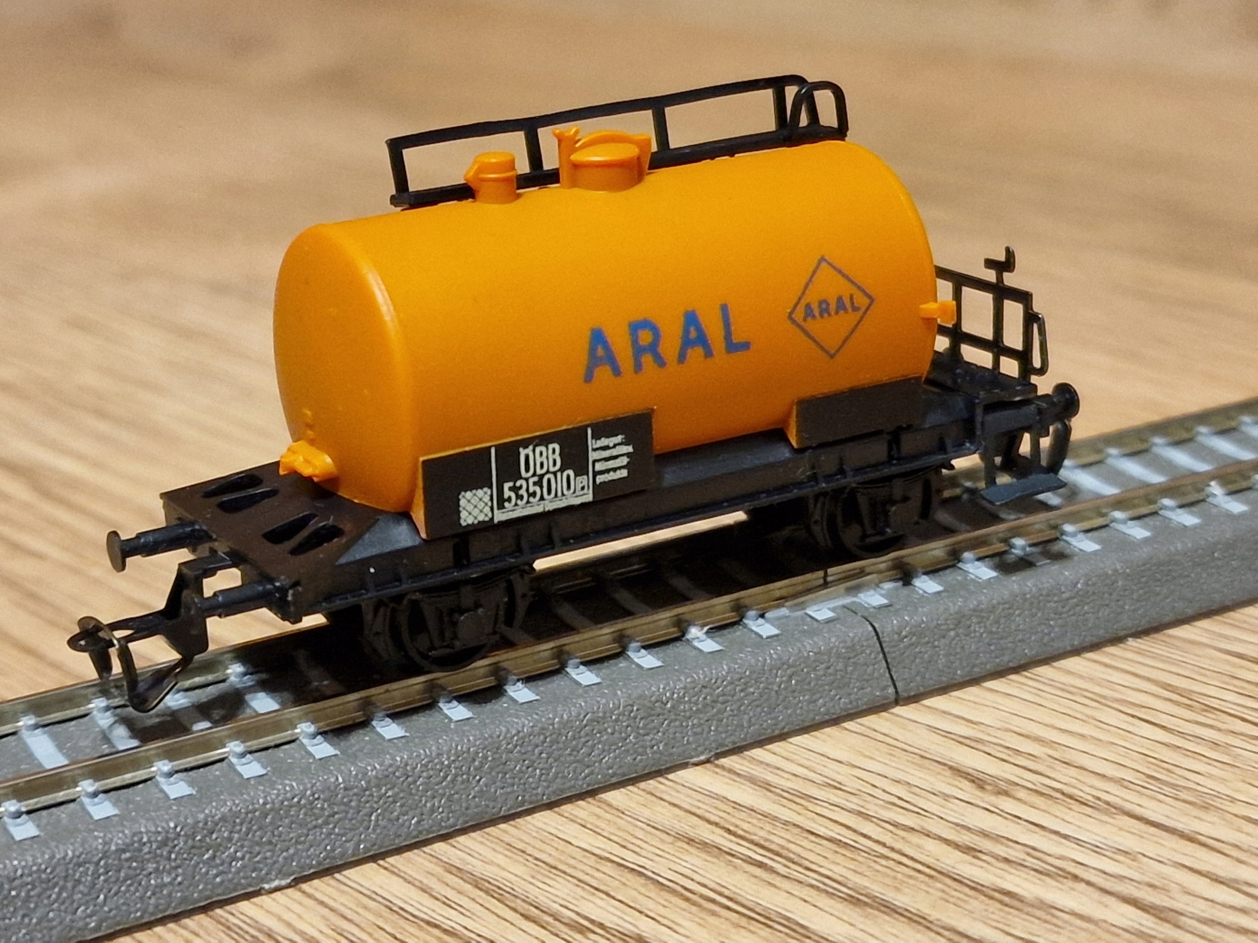 ... двовісна цистерна АРАЛ з маркуванням управління залізниці ОББ. Модель від Berliner TT Bahnen. Модель б/в, стан дуже хороший. Бампери повні, муфти повні, пластикові диски чисті. Упаковка для безпечного транспортування