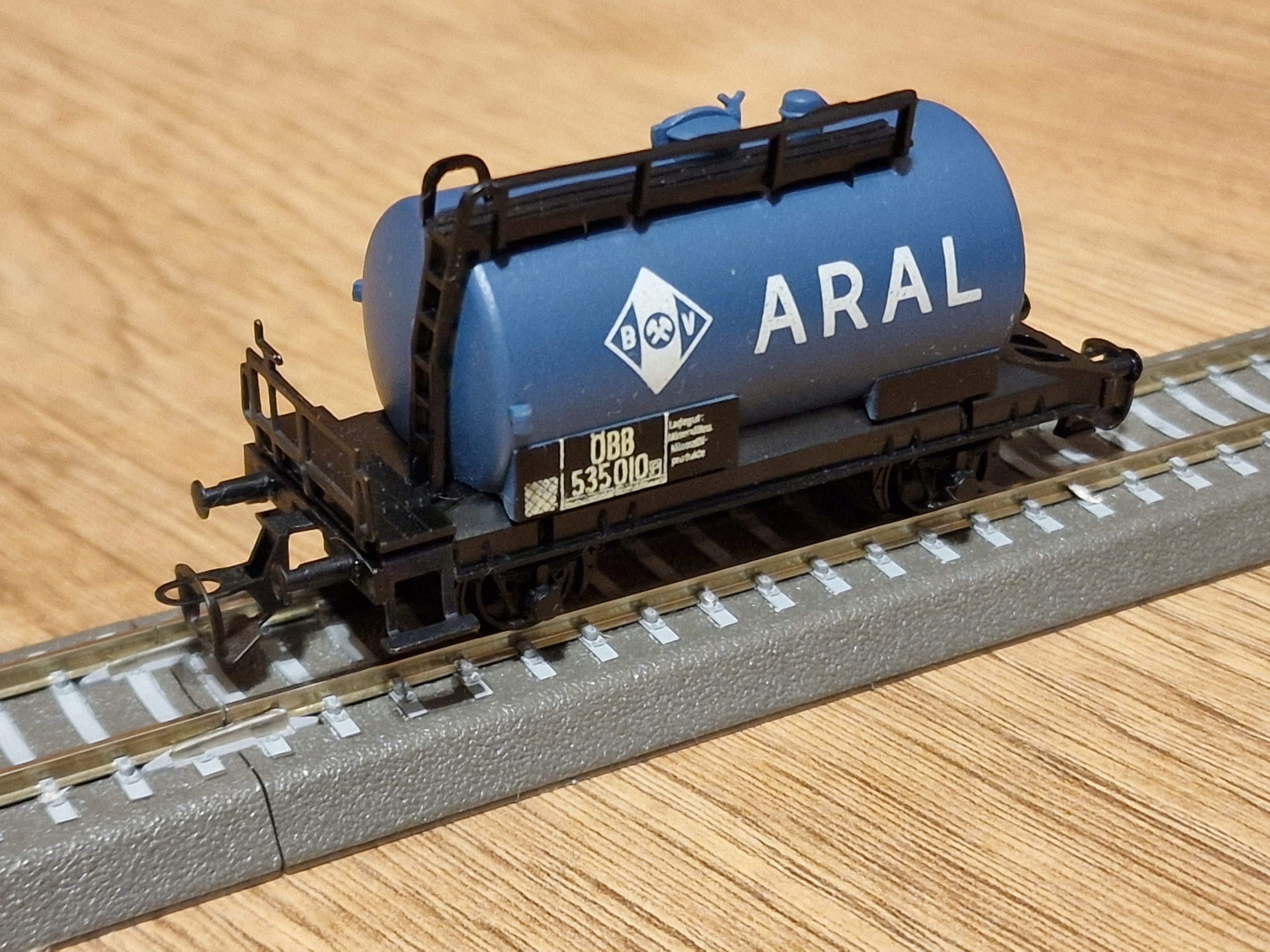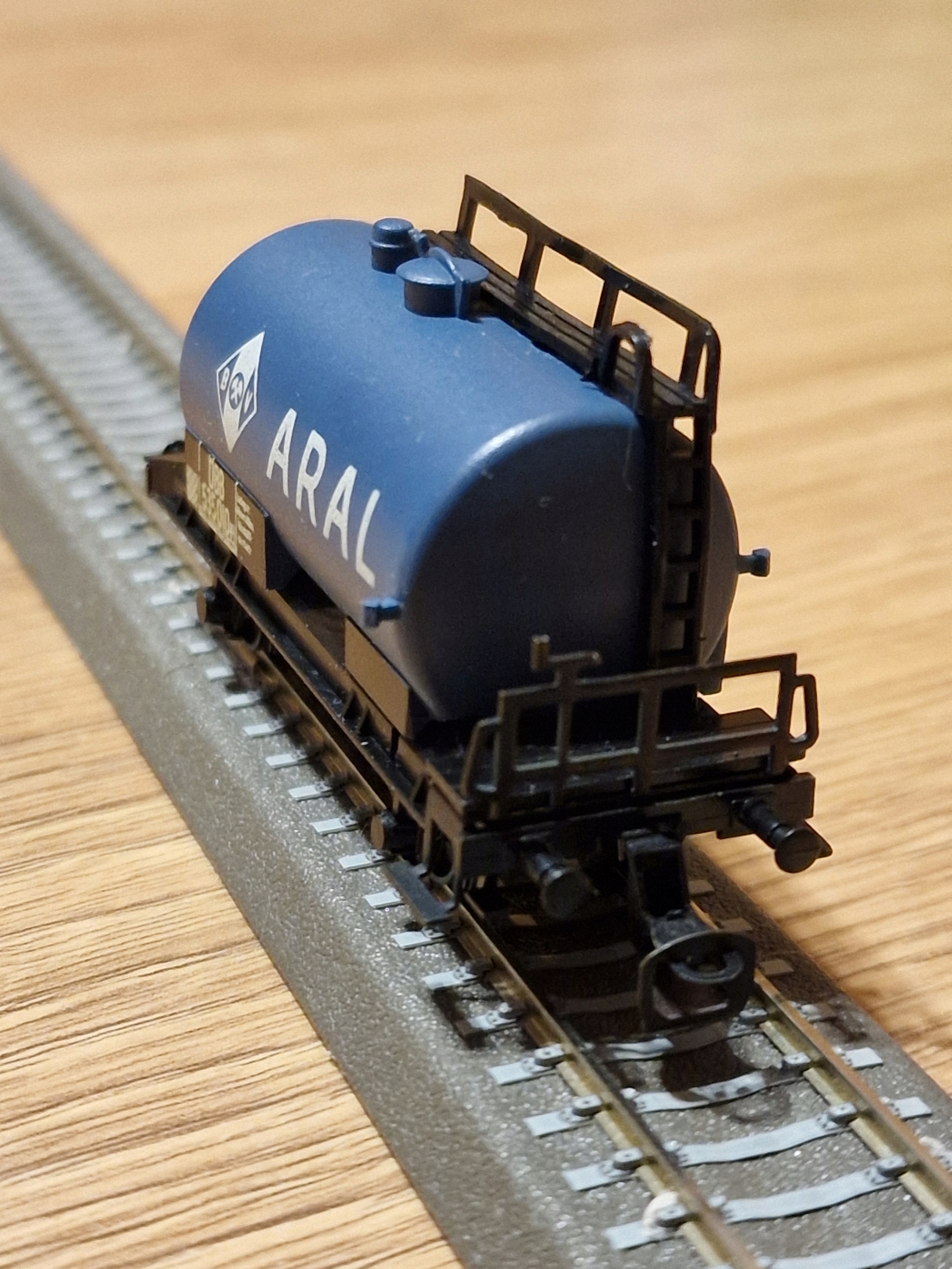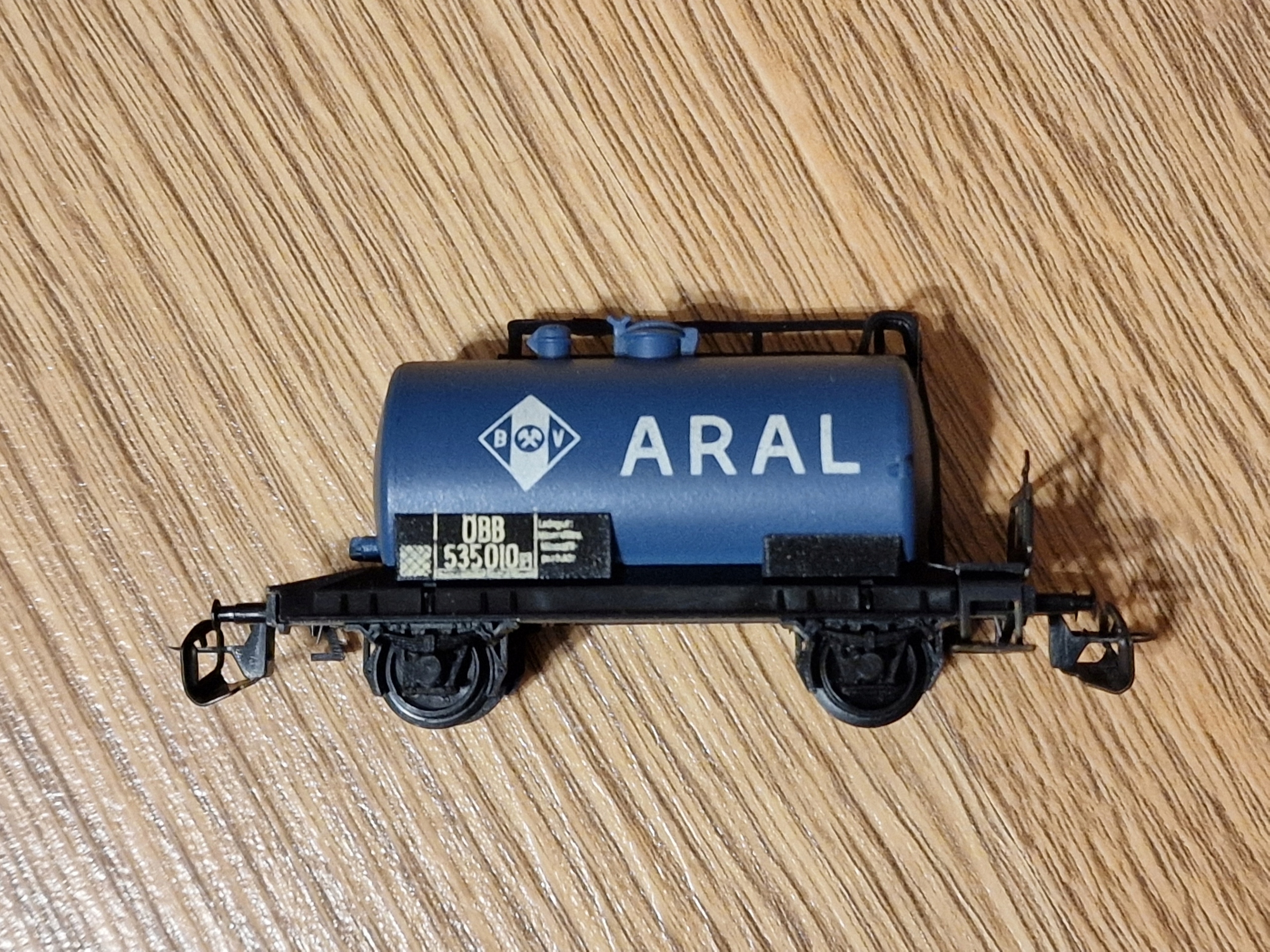 ... двовісна цистерна АРАЛ з маркуванням управління залізниці ОББ. Модель від Berliner TT Bahnen. Модель б/в, стан дуже хороший. Бампери повні, муфти повні, пластикові диски чисті. Упаковка для безпечного транспортування