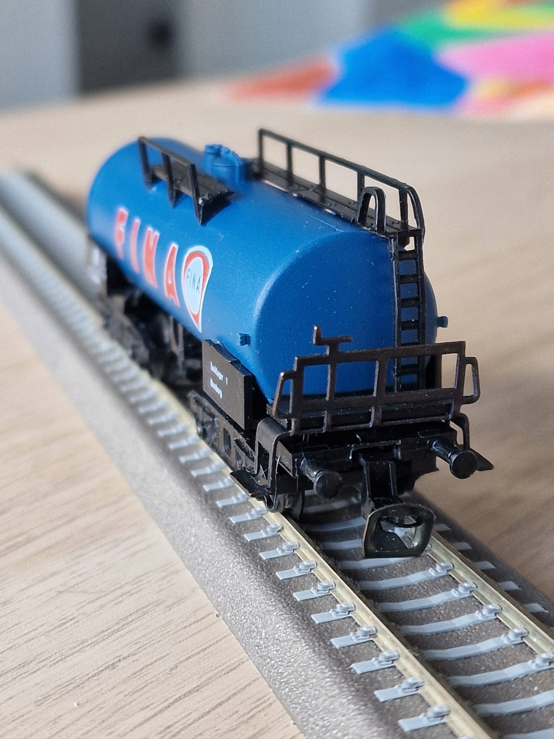 ...цистерна чотиривісна FINA з маркуванням управління залізниці ДБ, масштаб ТТ (1:120). Модель від Berliner TT Bahnen. Модель б/в, в хорошому стані з мінусом. Поруччя малої платформи на цистерні цистерни тріснуте в одному місці (пошкоджень та зсувів немає). Бампери повні, муфти повні, пластикові диски чисті. Упаковка для безпечного транспортування