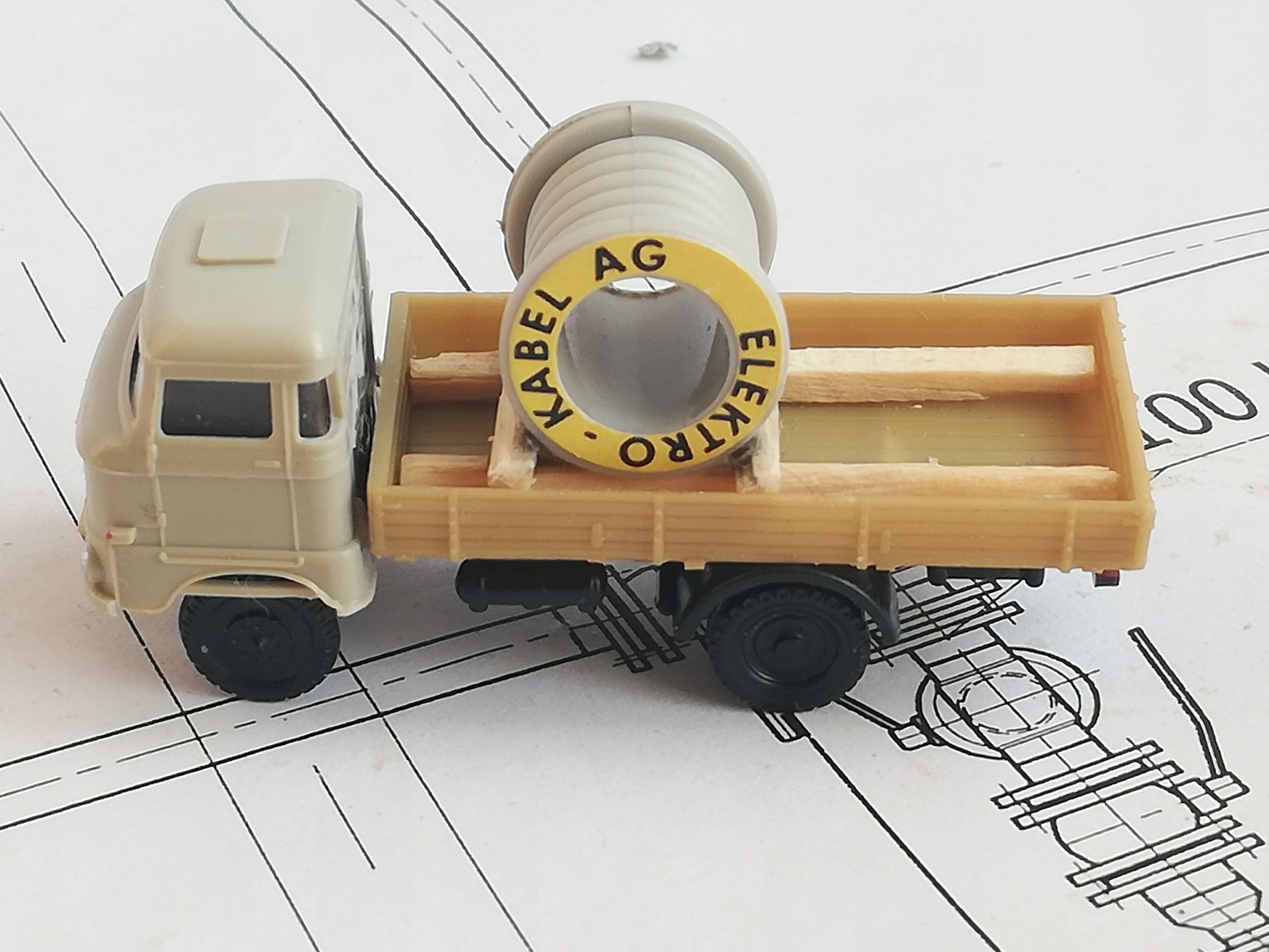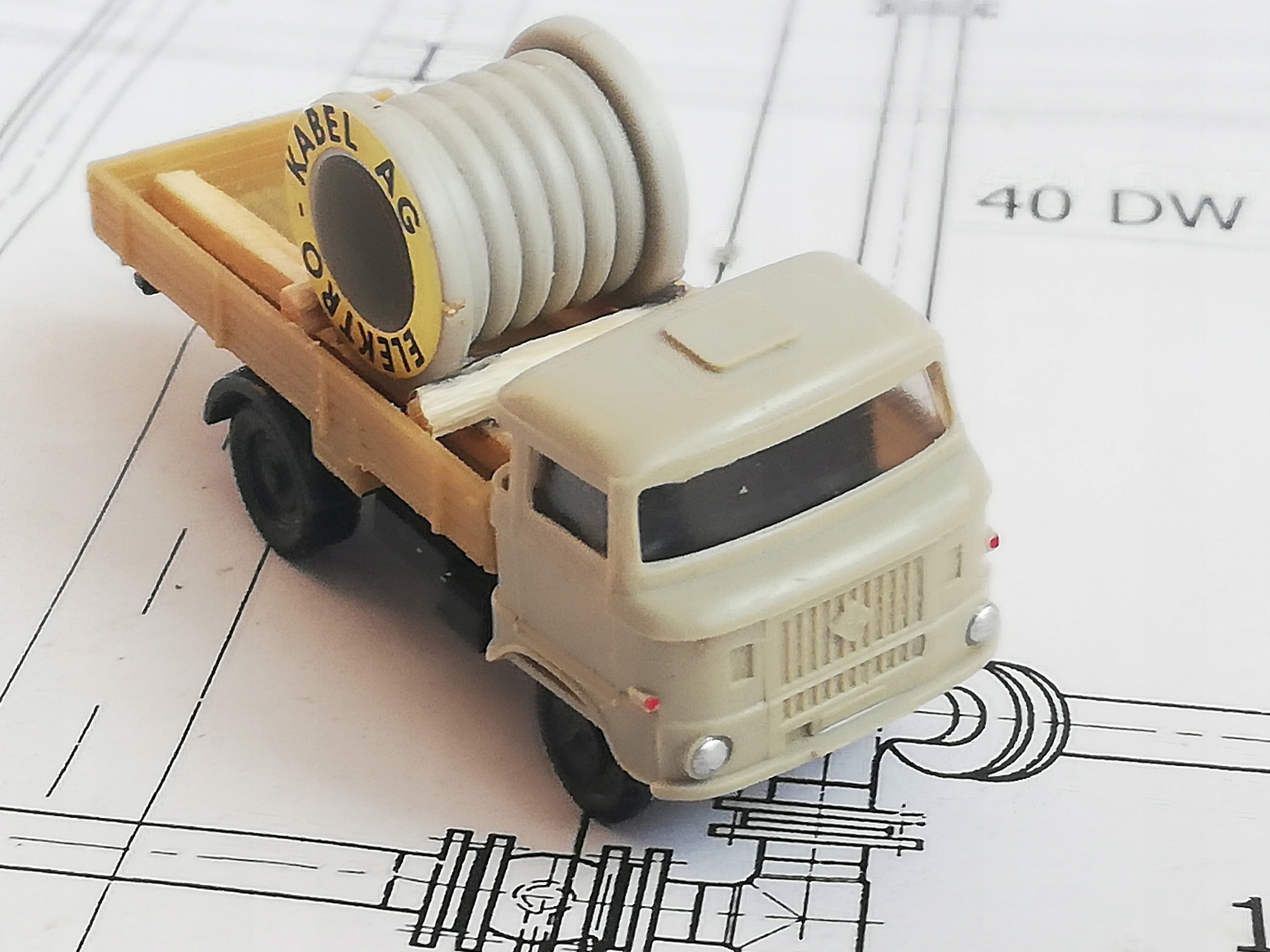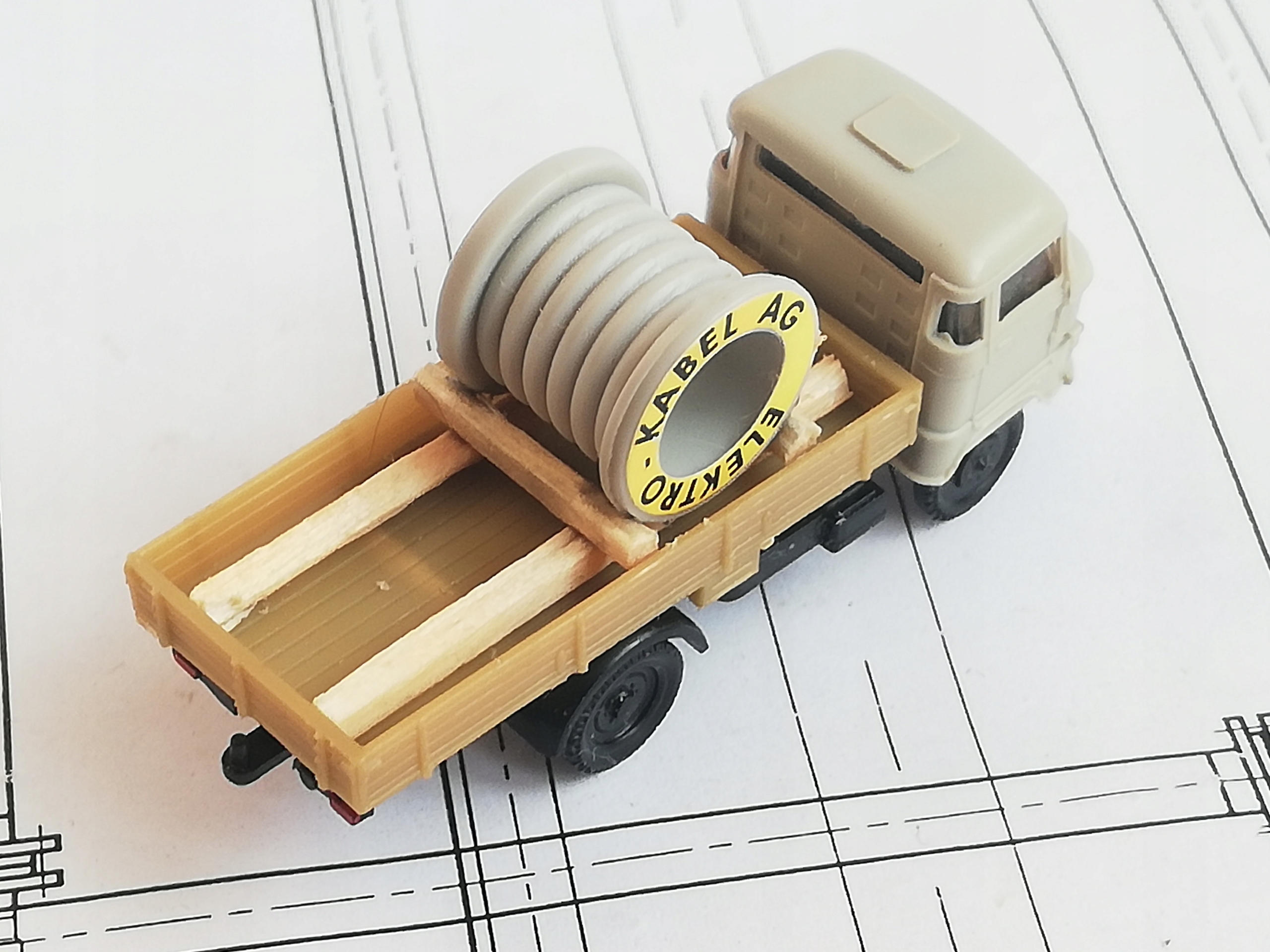 ...Вантажівка Ifa W50 L, коробка плюс вантаж, барабан з кабелем, масштаб ТТ (1:120). Модель Berlinplast. Модель б/в, стан дуже хороший. Незначні сліди використання. Упаковка для безпечного транспортування