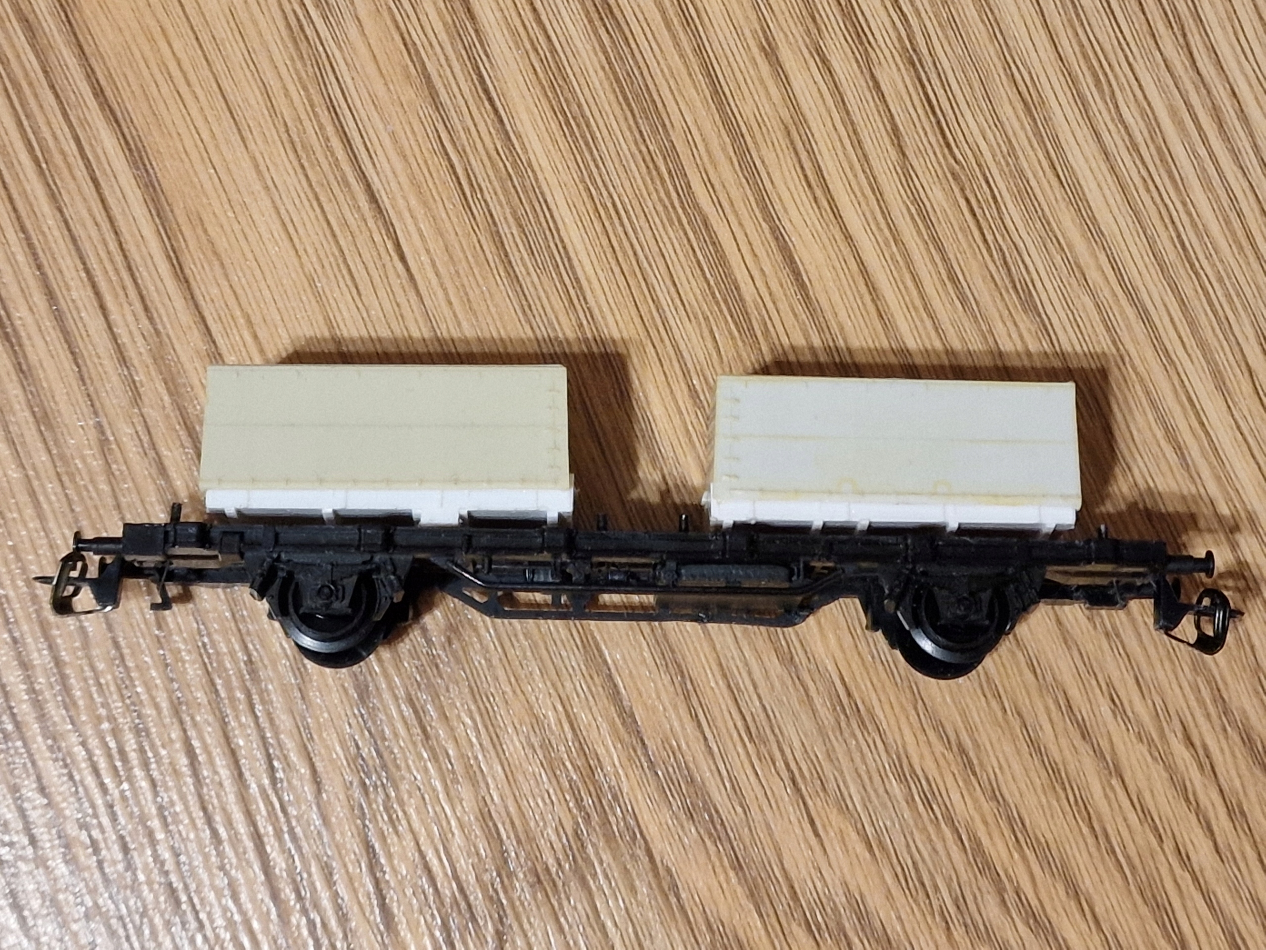 ... двовісна платформа з двома кузовами для IfyW50, масштаб ТТ (1:120). Модель від Berliner TT Bahnen. Модель б/у, в хорошому стані. Конструкції міцно приклеєні до платформи, помітні сліди клею. Брус, проклеєний у двох місцях під шасі вагона. Бампери повні, стяжки повні, пластикові диски чисті. Упаковка для безпечного транспортування