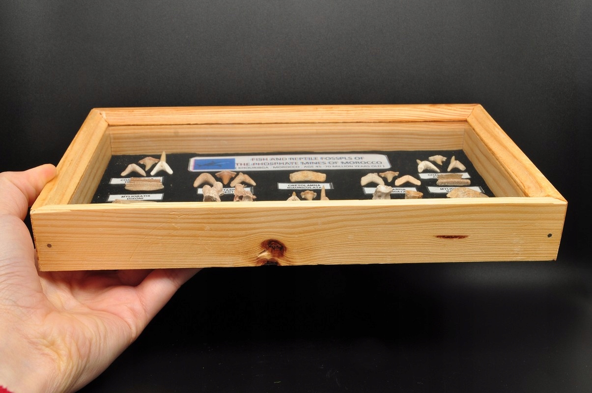 У вітрині представлені хребці та зуби доісторичних риб, зокрема акул, скатів, морської змії та плезіозавра. Чудовий подарунок для вашої колекції.