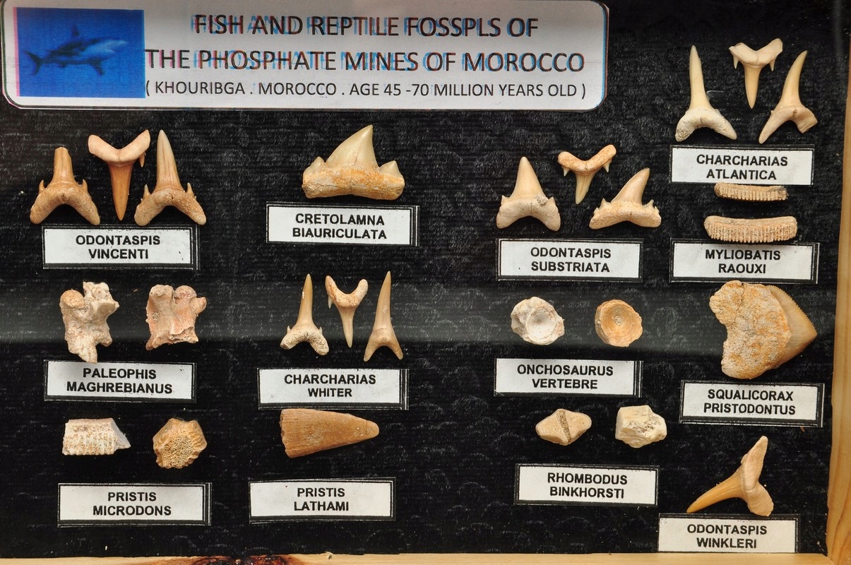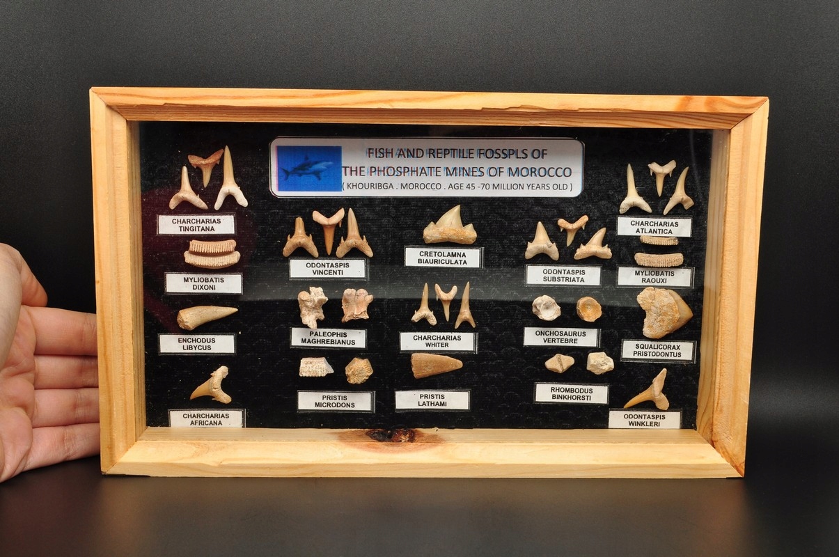 ПРИРОДНІ ЗАКИПІННОСТІ РИБНИХ МІСЦЬ - ЗУБИ, ВЕРШИНИ. ЗРАЗКИ ВІКОМ 70–45 МІЛЬЙОНІВ РОКІВ З ФОСФАТНИХ ШАПНИКІВ МАРОККО. РОЗМІЩЕНИЙ В ЗАСКЛЕНУ ВАТРУ.