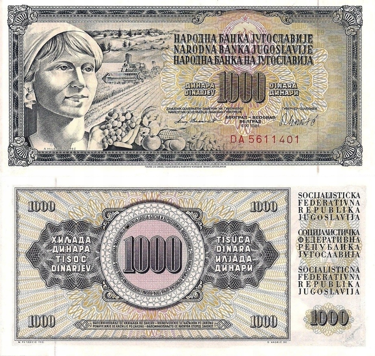 # ЮГОСЛАВІЯ - 1000 ДИНАРІВ - 1981 - P-92d - UNC