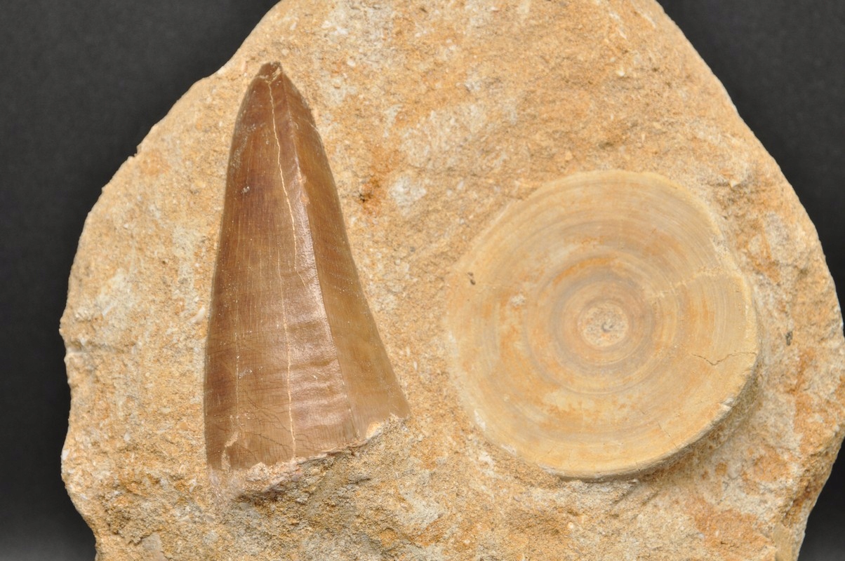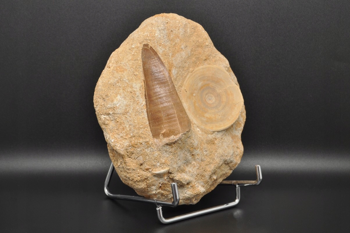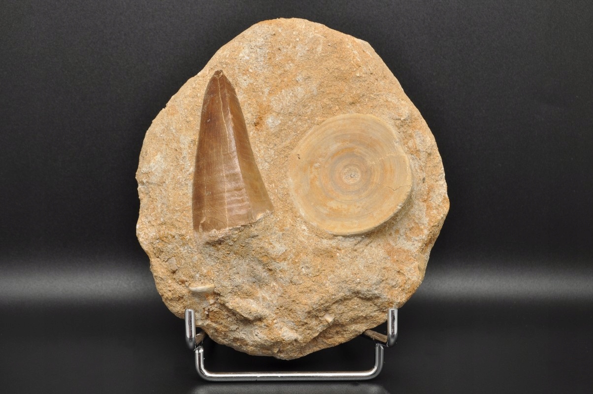 * ZĄB MOSASAURA NA SKALE Z KRĘGIEM Z KRĘGOSŁUPA ŁADNIE ZACHOWANY MAROKO 1 *