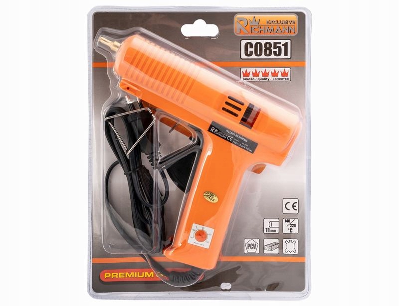 Клейовий пістолет з можливістю налаштування регулювання температури в діапазоні від 140 до 220 градусів Цельсія . Пістолет оснащений латунною насадкою і підставкою для полегшення роботи, а також сигнальною лампою. Пістолет RICHMANN Exclusive можна використовувати для моделей іграшок, штучних квітів, декорування дерев'яних і паперових виробів, електроніки. Рушниця розігрівається від 5 хв до 8 хв. Пістолет C0851 RICHMANN Exclusive сумісний з клейовими картриджами діаметром 11 мм. Великий зручний курок полегшує точне дозування. Під час роботи з пістолетом RICHMANN Exclusive, якщо весь клей не використано за один прийом, розчинений клей не потрібно зливати, і його можна використовувати для наступного використання. Не рекомендується використовувати клей іншого діаметра, оскільки це може пошкодити виріб.