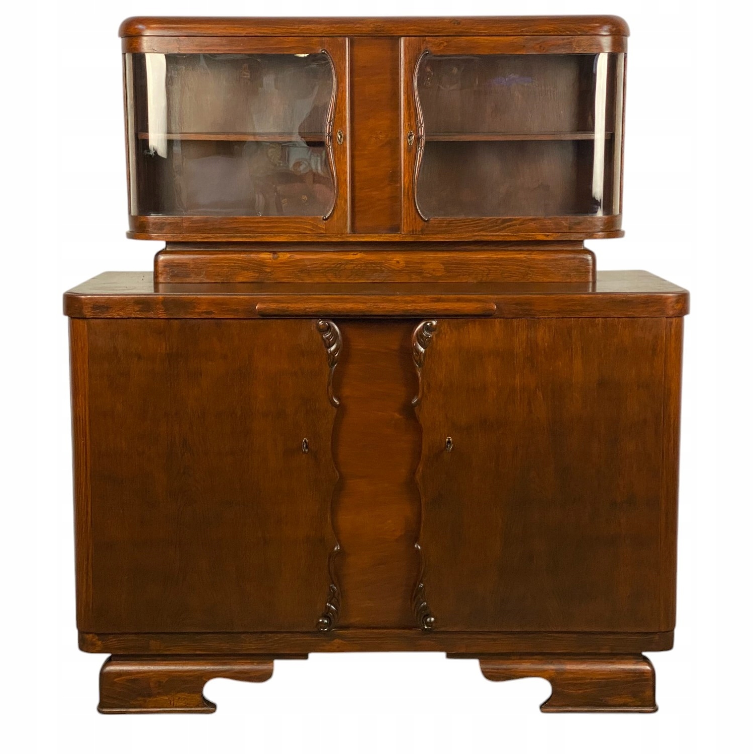 Стара стильна тумба з вітриною з напівкруглим склом кольору горіха, оснащена висувним помічником з каменю.