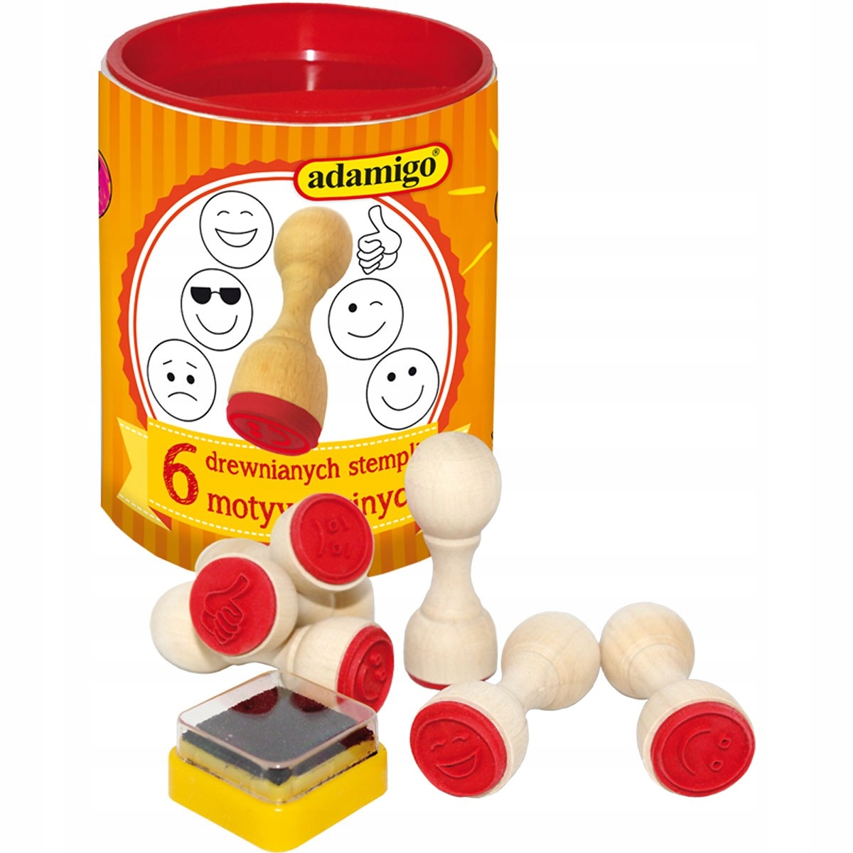 Набір з 6 дерев’яних марок для прикраси канцелярських товарів, прикраси подарунків, створення ваших композицій, оцінка роботи, забарвлення. У коробці, крім штампів, є подушка з чорнилом. Творча забава для наймолодших!