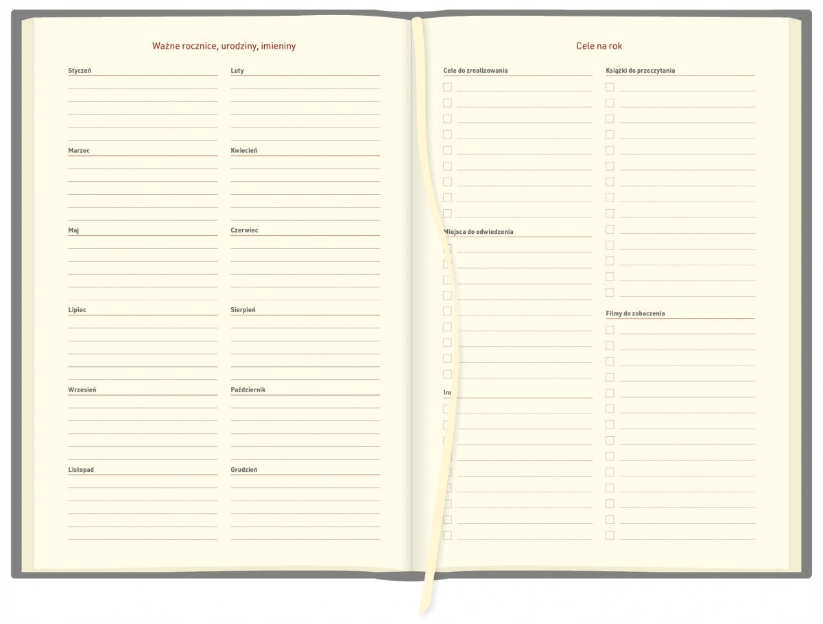 надрукований на папері благородної замші (відтінок екрю). Картки розміром 14,3 х 20,4 см. Багато місця для записів. Мінімум непотрібних добавок.