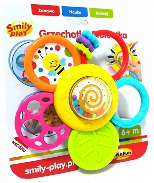 stokrotka ratchet - це іграшка 2 в 1. Активація квітки - це храповик і тейтер. Це спонукає дитину розвивати почуття. Кожен з п’яти барвистих пелюстків ромашки має різну функцію. Він має присоску, завдяки якій ми можемо легко прикріпити її до гладкої та плоскої поверхні.