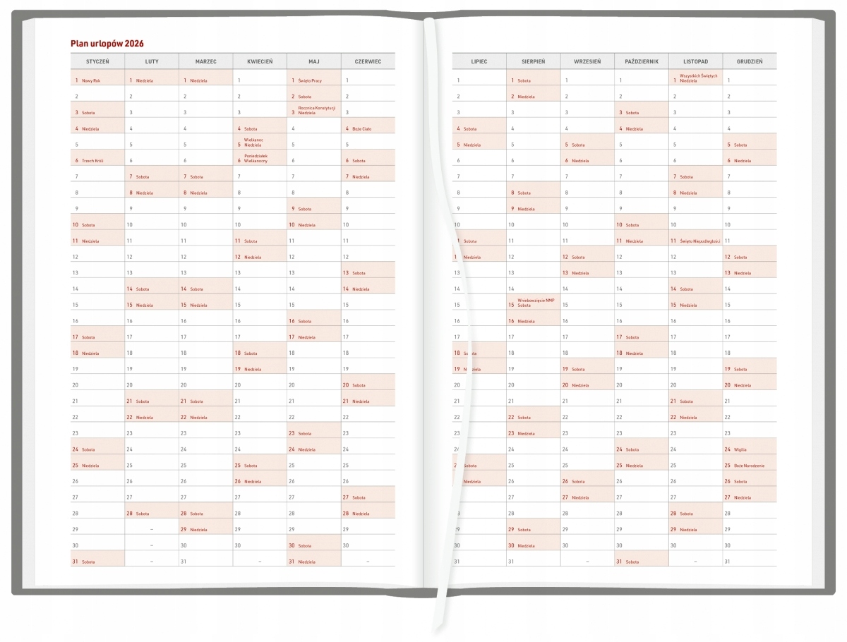 дні тижня на окремих сторінках, субота та неділя на загальній сторінці. 360 сторінок.