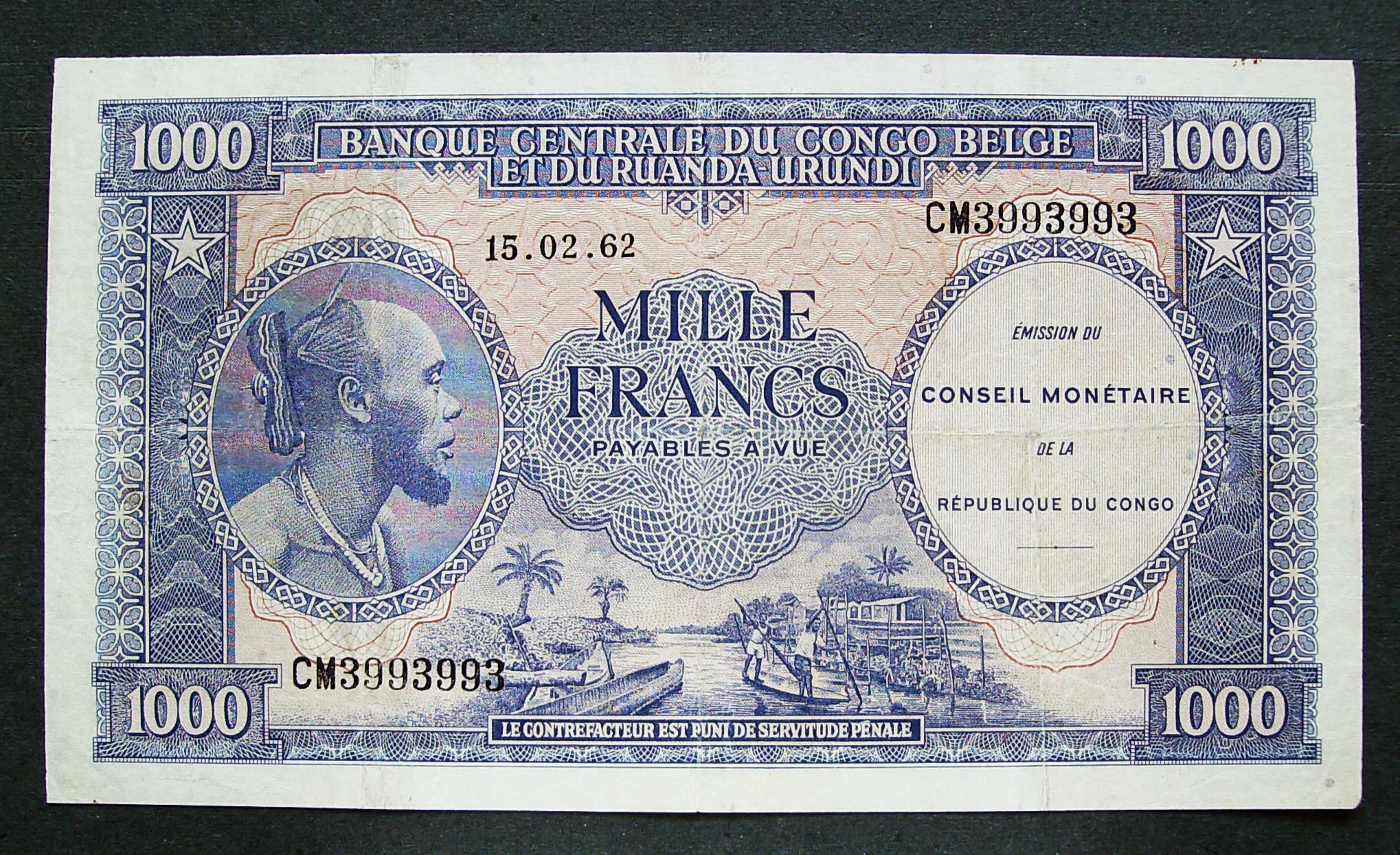 1 000 franków 1962 ser. CM 3993993 ( KONGO BELGIJSKIE ) rzadki