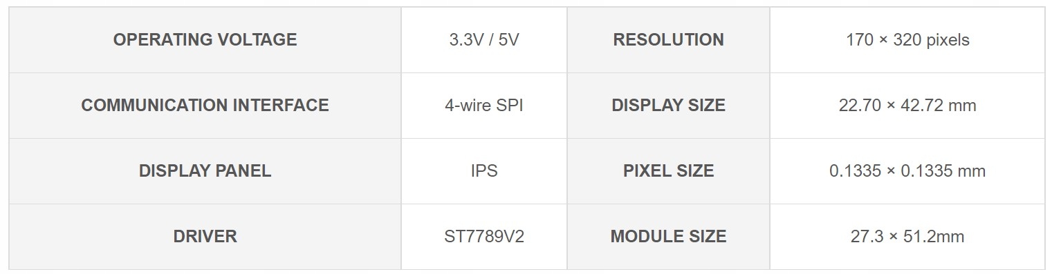 - Вбудована мікросхема драйвера ST7789V2, що використовує інтерфейс SPI