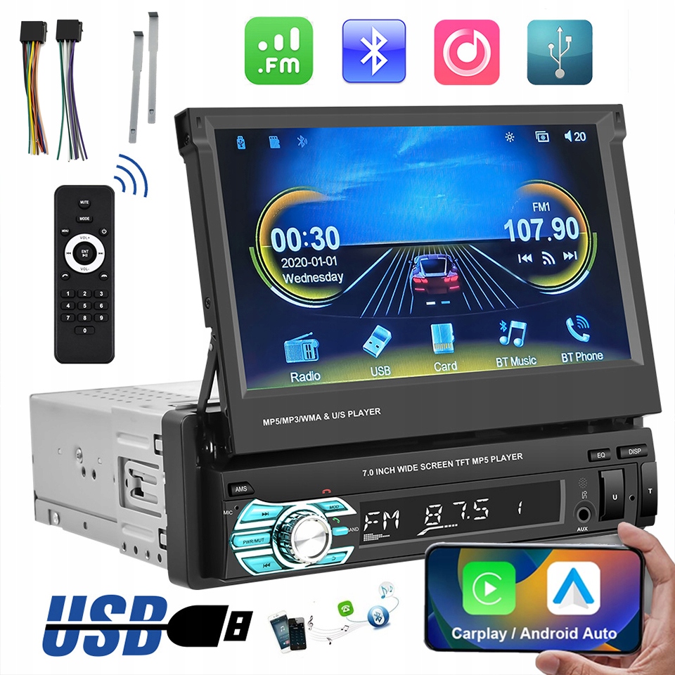 1-DIN 7-ДЮЙМОВИЙ АВТОМОБІЛЬНИЙ РАДІО ВІДСУВНИЙ СЕНСОРНИЙ ЕКРАН CARPLAY ANDROID AUTO