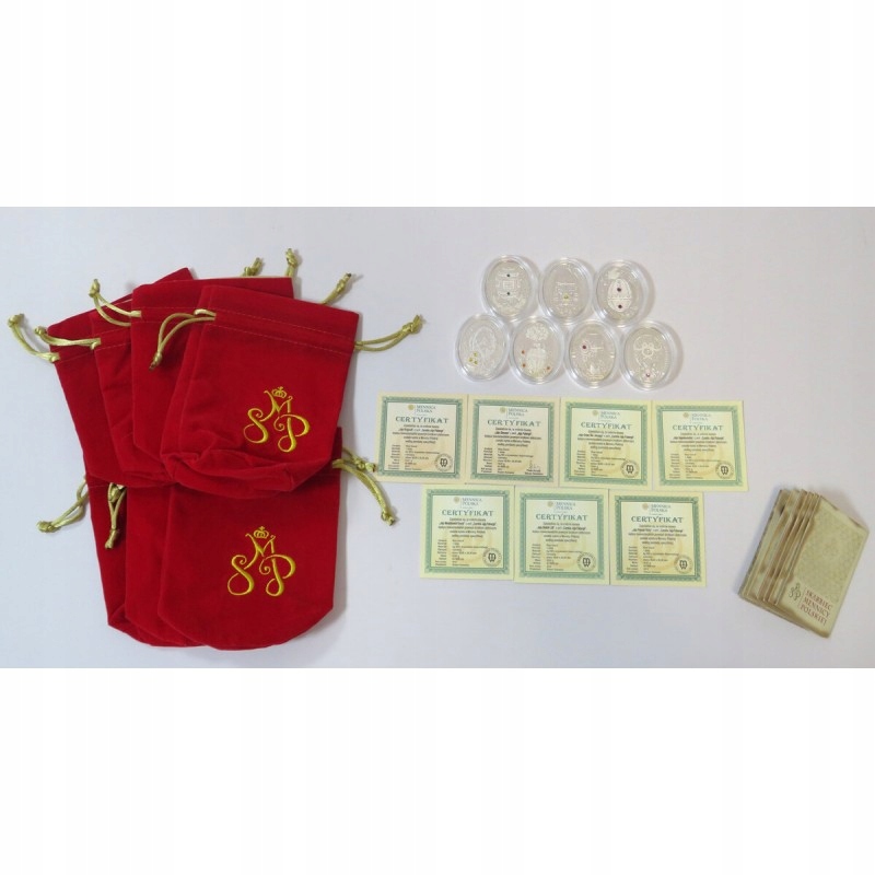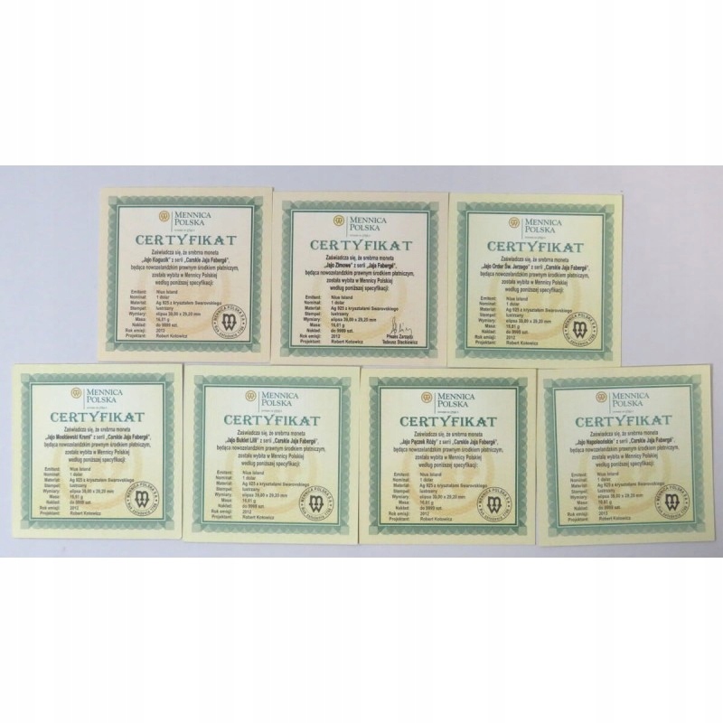 Набір із 7 монет із серії «Царські яйця Фаберже» 2012 року. Монети в ексклюзивних пакетах із сертифікатами (на кожну монету)