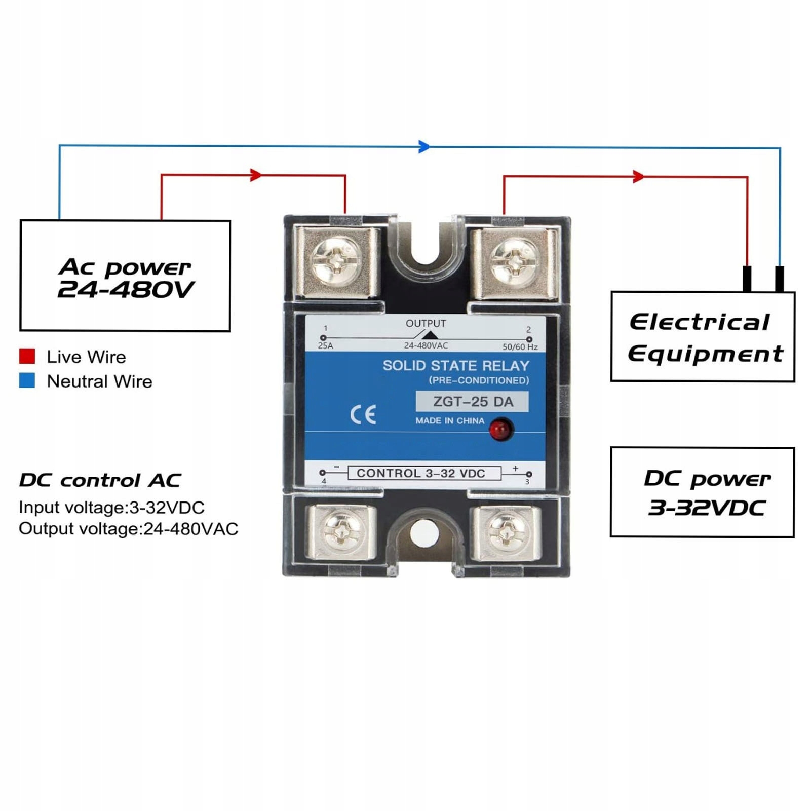 1. Технічні параметри: SSR 25DA, 3-32VDC/ 24-480VAC модуль SSR; Струм і частота - 25 A 50/60 Гц