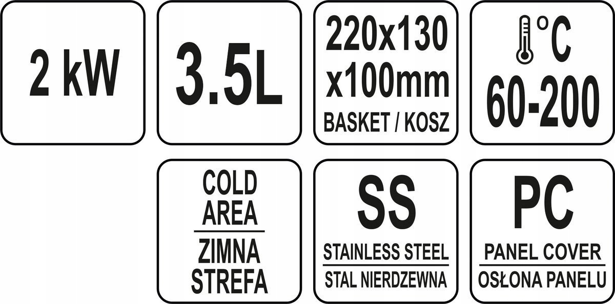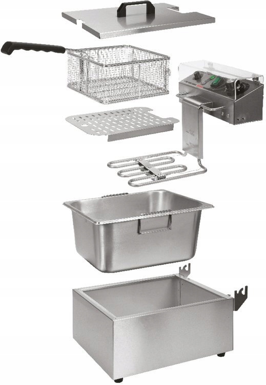 Нагрівач потужністю 2,0 кВт b> контролюється за допомогою потенціометра, розташованого на панелі керування. Робочу температуру можна встановити в діапазоні 60~200℃. Встановлений захищений від бризок вимикач дозволяє вимкнути пристрій, не від'єднуючи кабель живлення від мережі. Крім того, панель управління має захисну кришку з дуже міцного полікарбонату, яка захищає панель від бризок олії під час смаження. Це значно полегшує утримання фритюрниці в чистоті. Знімний обігрівач можна повісити на спеціальний тримач у такому положенні, де масло, що капає, повертається в резервуар. Фритюрниця має додаткову функцію безпеки, яка автоматично вимикає нагрівач, коли вона виймається з бака. Додатковий захист захищає її від перегріву за температури вище 260 ℃.