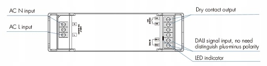 DH1 — це 1-канальний релейний модуль, що працює як перемикач освітлення 230 В змінного струму в системі DALI. Освітлення можна вмикати або вимикати через шину DALI. Пристрою можна призначити 1 адресу DALI і він сумісний із системою DALI DT7. Робоча напруга контролера 100-240VAC. Вихід реле може бути навантажений до 10А в залежності від типу освітлення. Для електричного монтажу використовуються суцільні гвинтові клеми.