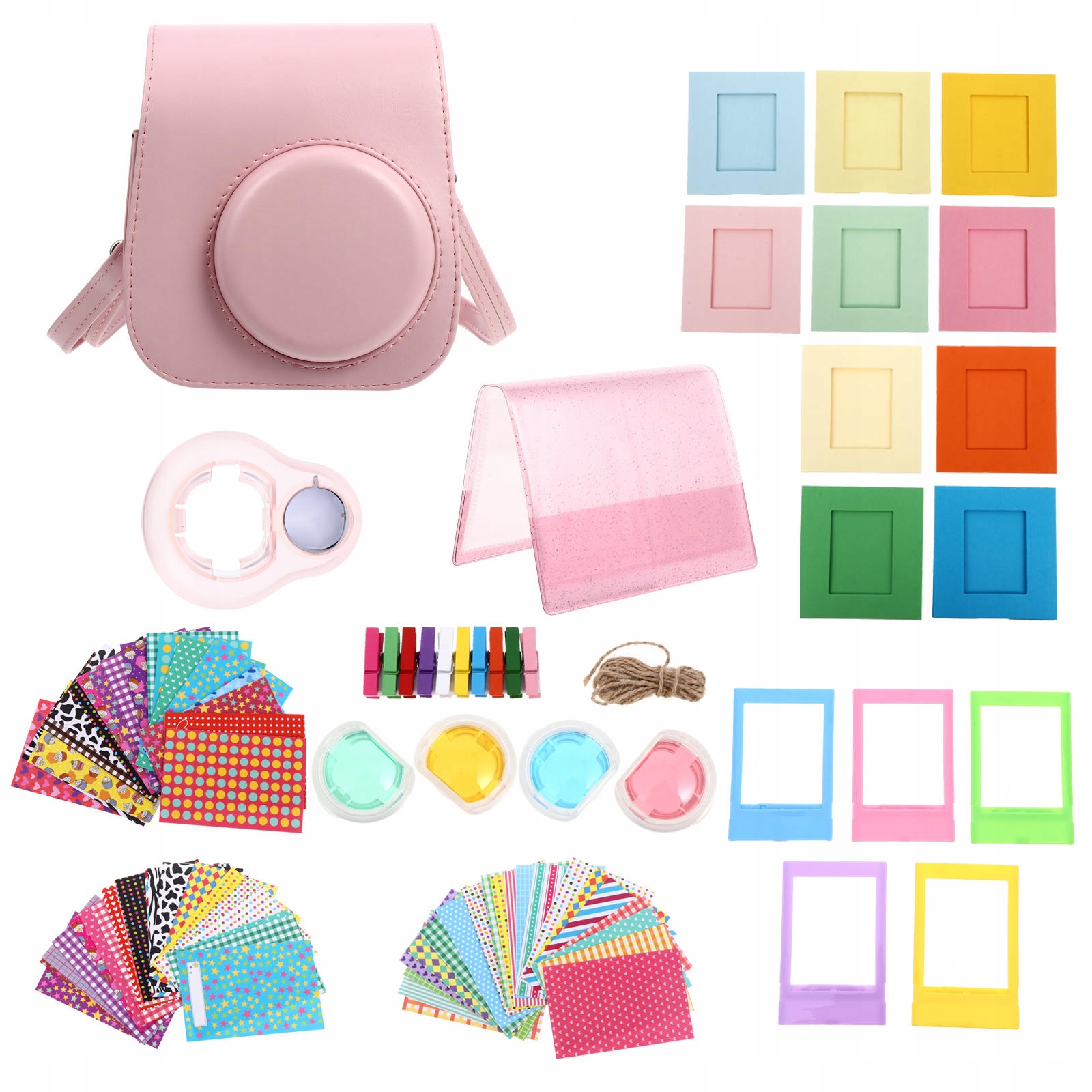 ✅ 1 сумка 10 паперових фоторамок (з дерев’яними затискачами та шнурками) 60 паперових альбомів 1 лінза для селфі 4 лінзи з фільтром 5 пластикових фоторамок