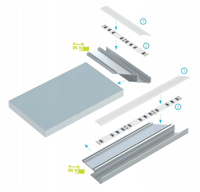 профілі ipa12 та apa12 є стельовими профілями для освітлення головних поглиблень та декоративних композицій. профілі IPA12/APA12 Це крайові профілі, розроблені для встановлення в картонних побічних побічних майданчиках на стелі або стіні.
