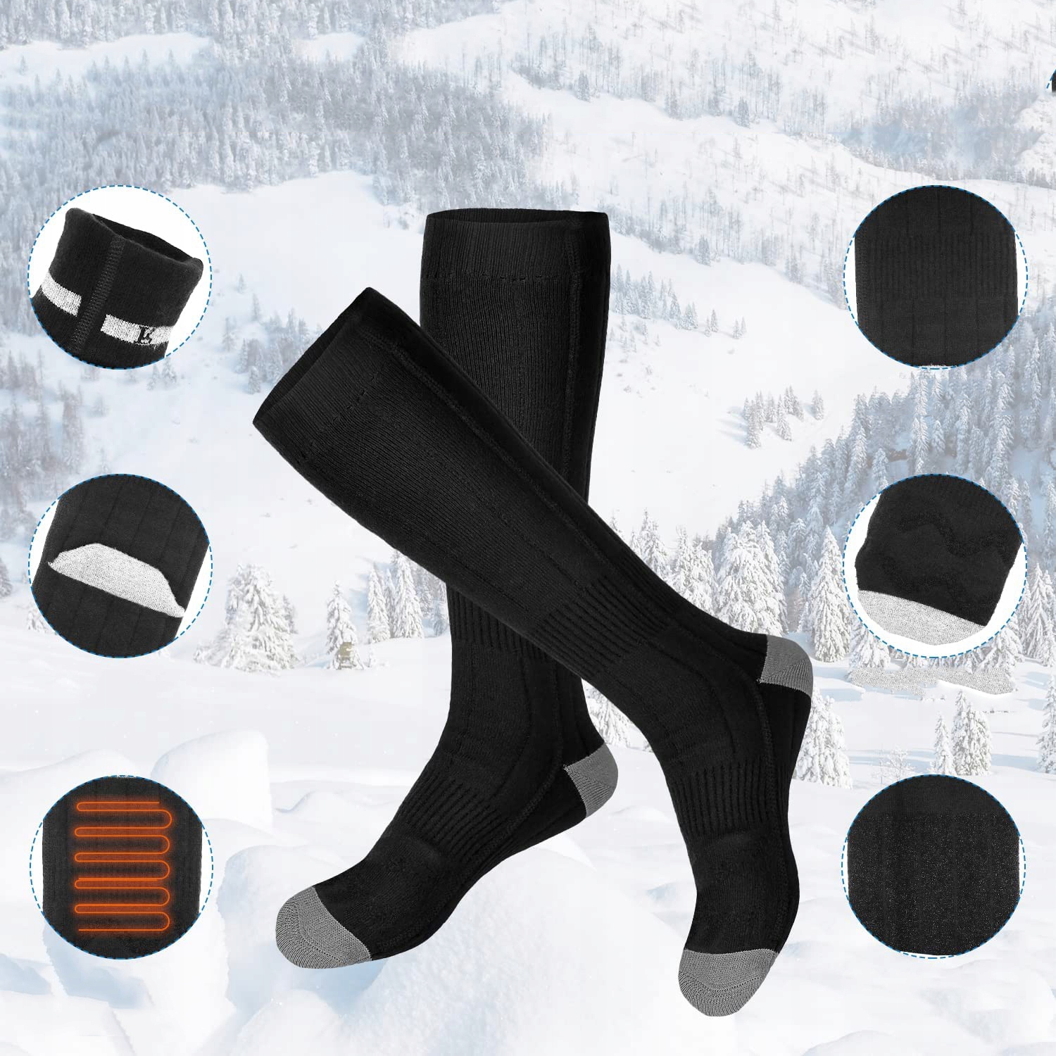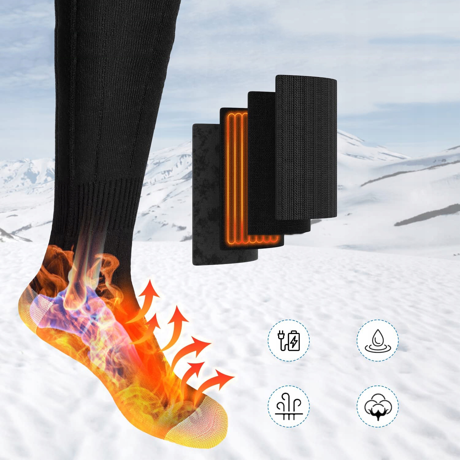 Шкарпетки з підігрівом виготовлені з безпечного матеріалу. Повітропроникна, швидковисихаюча, спеціально розроблена вогнестійка бавовна забезпечує відчуття безпеки під час використання. Що ще важливіше, інфрачервоні нагрівальні елементи шкарпеток можуть стимулювати кровообіг.