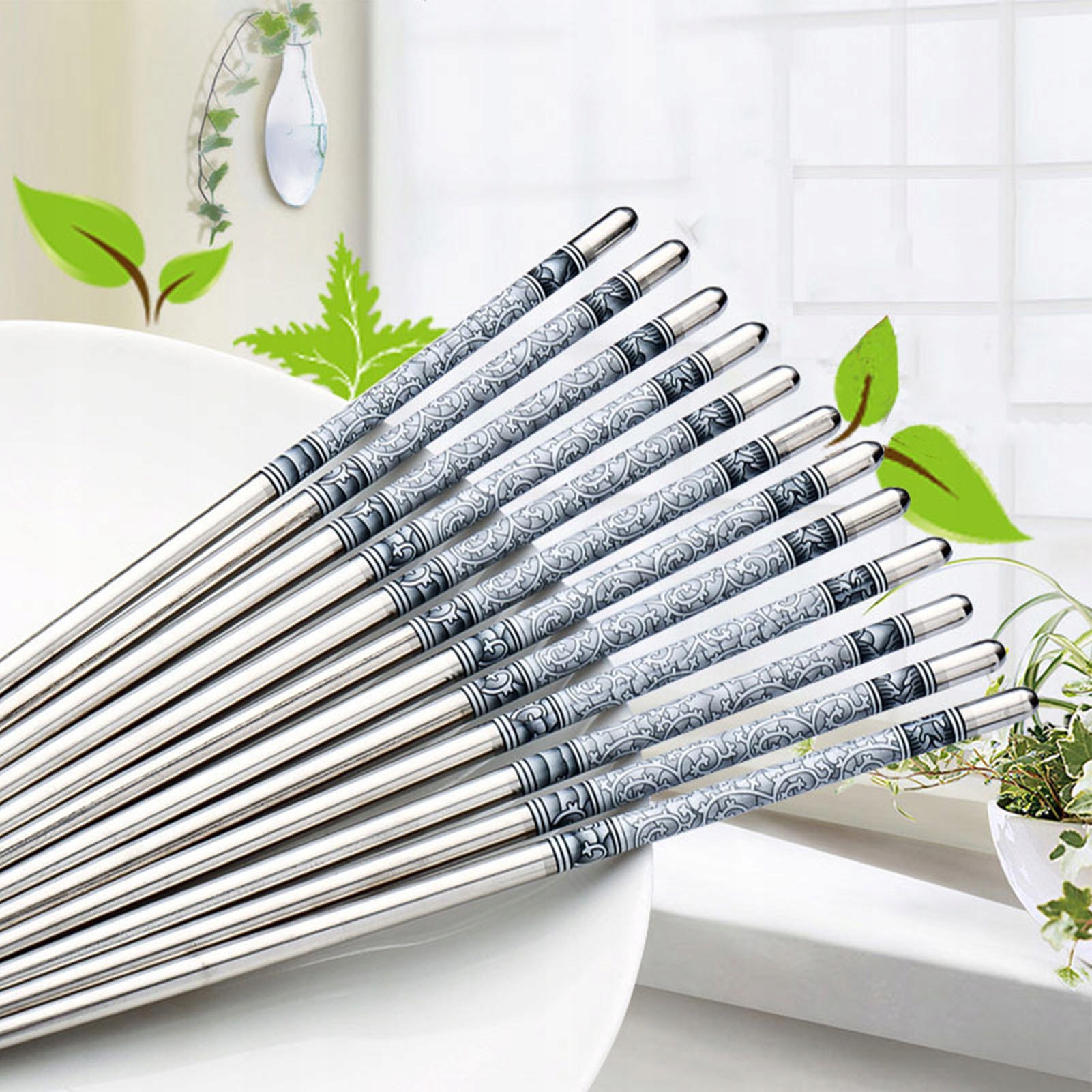 1. Елегантний вигляд: палички з нержавіючої сталі мають традиційний синій та білий вигляд порцеляни, що додає витонченості вашому стравам.