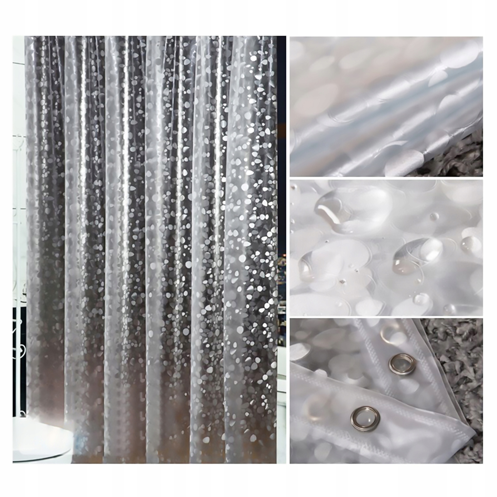 Функція:1. Кожна завіса для душу оснащена посиленою верхньою металевою петлею та 12 кабельними кільцями, які запобігають защемленню та є достатньо міцними, щоб під’єднати різні типи гачків для душової завіси.