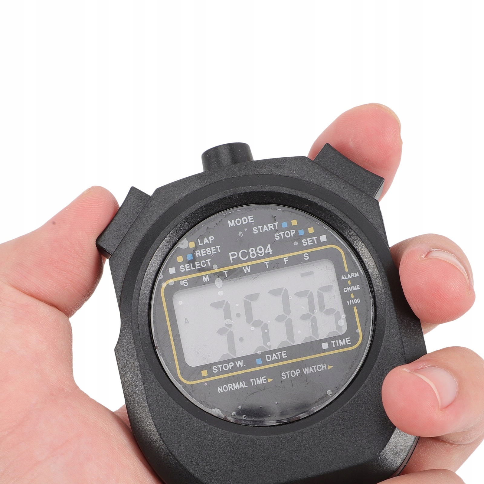 Секундомір легкий, важить лише 0,12 кг, ергономічний, ідеально адаптується до форми руки. Кнопки вимірювання розташовані поруч із великим і вказівним пальцями.