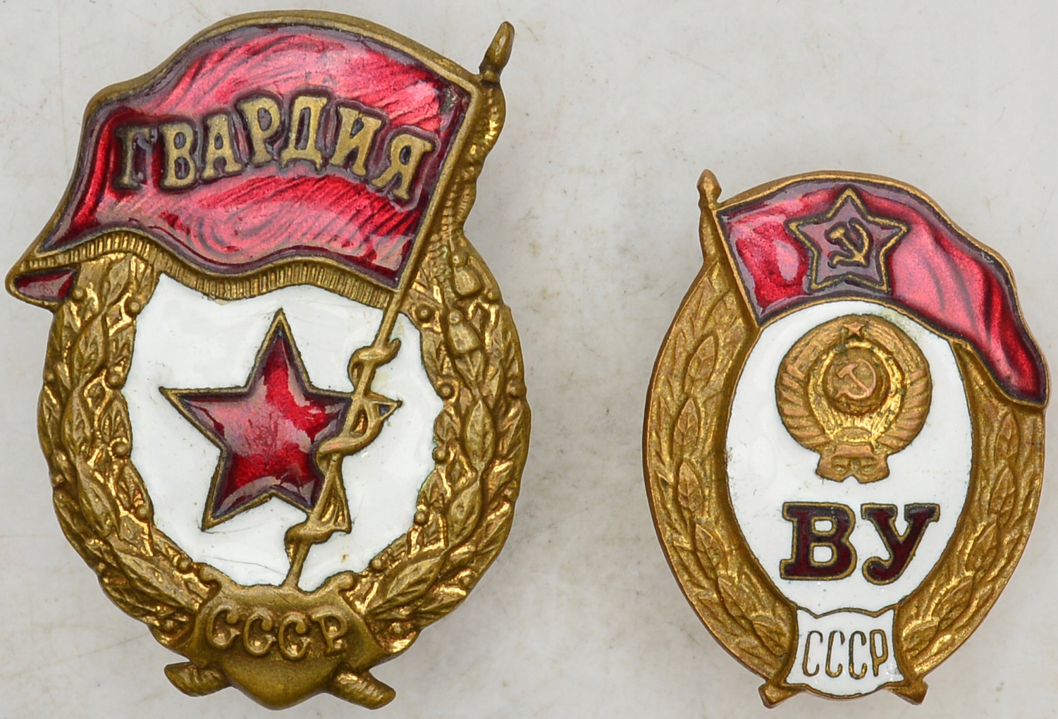 - Опис: У набір входять: білорусь - знак випуску військового училища (1950 року випуску), розміри приблизно 37 мм х 28 мм; Нагрудний знак Радянської гвардії (1942 р.), розміри приблизно 46 мм х 35 мм, тріщини та невеликий скол на білій емалі