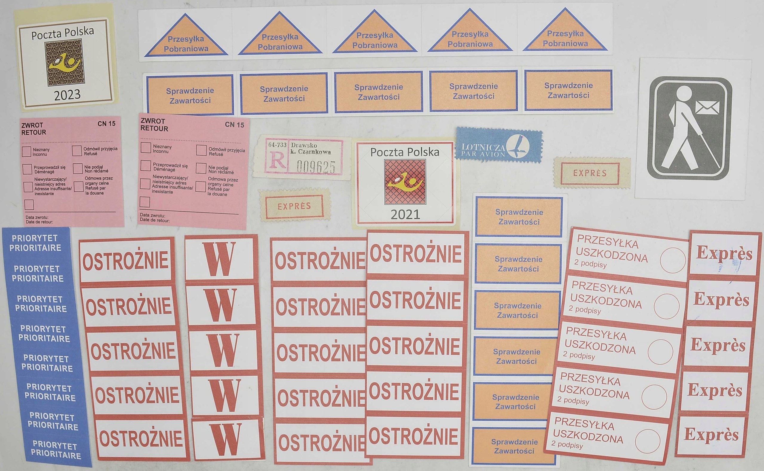 - Опис: У набір входить набір польських бланків а також бланки та поштові наклейки з 1930-х років. до сучасності, в тому числі: чисті телеграми, грошові перекази та поштові посилки, службові конверти, конверти Choprągiewski для поштових мішків, повідомлення тощо. Усі незаповнені