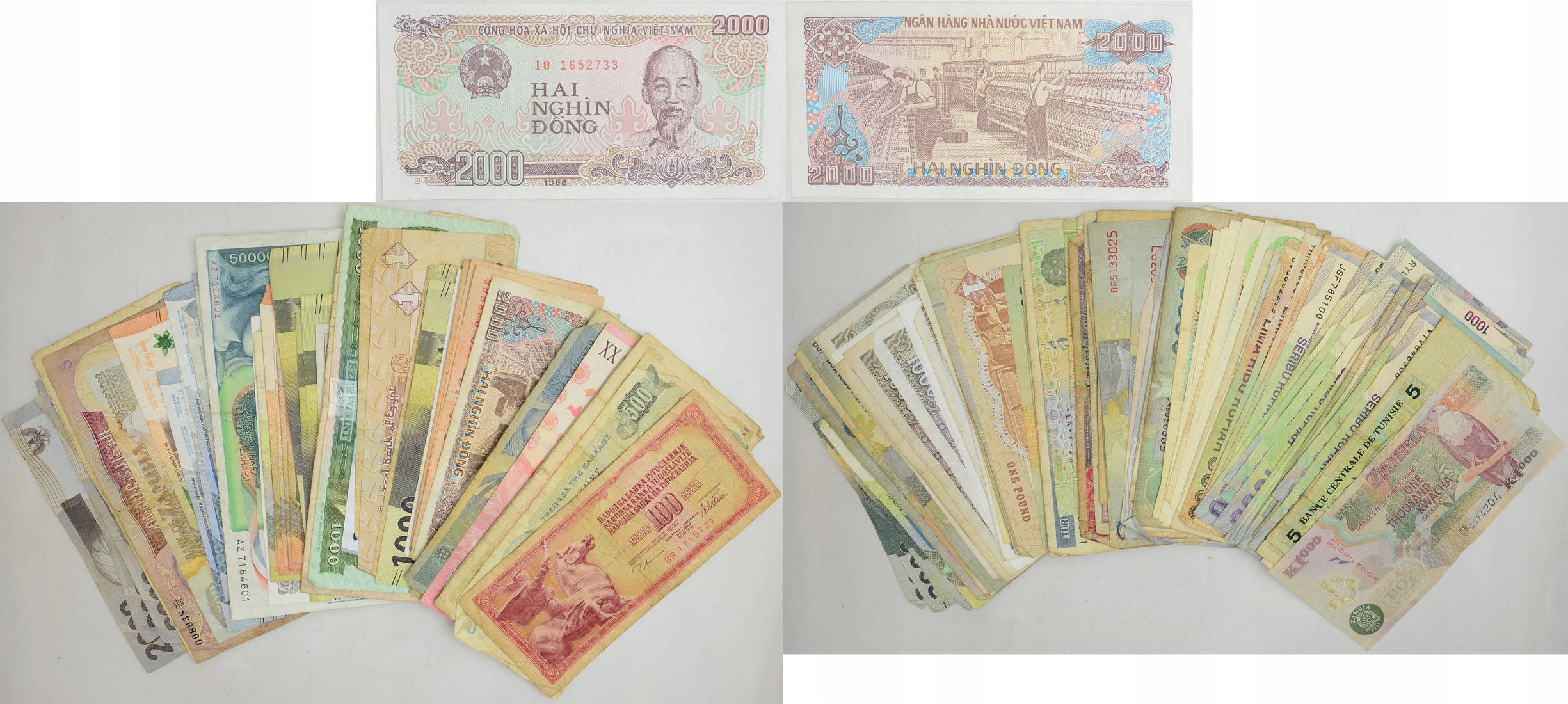 - Опис: У набір входять банкноти різних країн світу з різними датами та номіналами, зокрема: В’єтнам, Індонезія, Угорщина