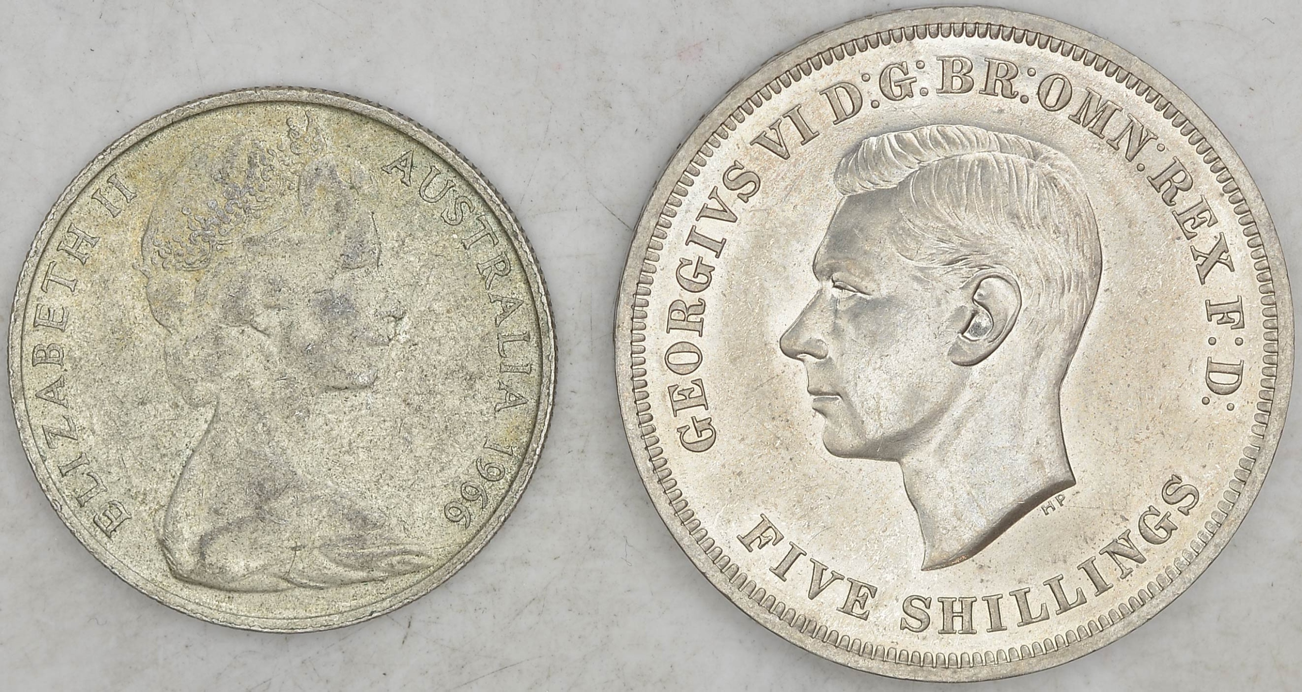 - Опис: У набір входять такі монети: Австралія - 50 центів 1966 (срібло) ; Велика Британія - 5 шилінгів 1951 Британський фестиваль.