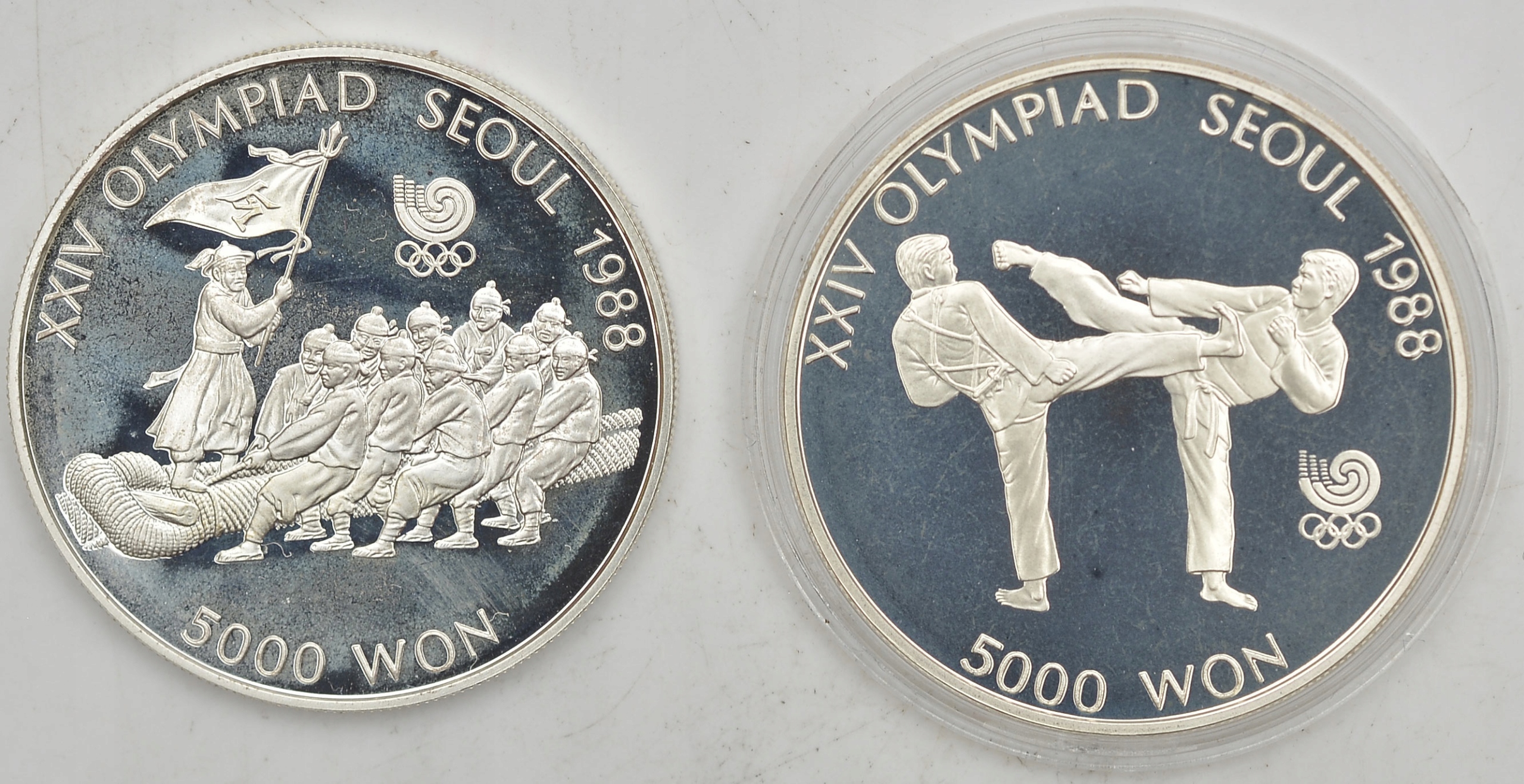 - Опис: І.О. СЕУЛ '1988. У набір входять монети з наступними датами: Перетягування канату 1986 (ступінь L-, відбитки пальців і мікроподряпини; монета без кришки), Тхеквондо 1987 (фото монети зроблено через кришку). Дзеркальний. Смуги патини.