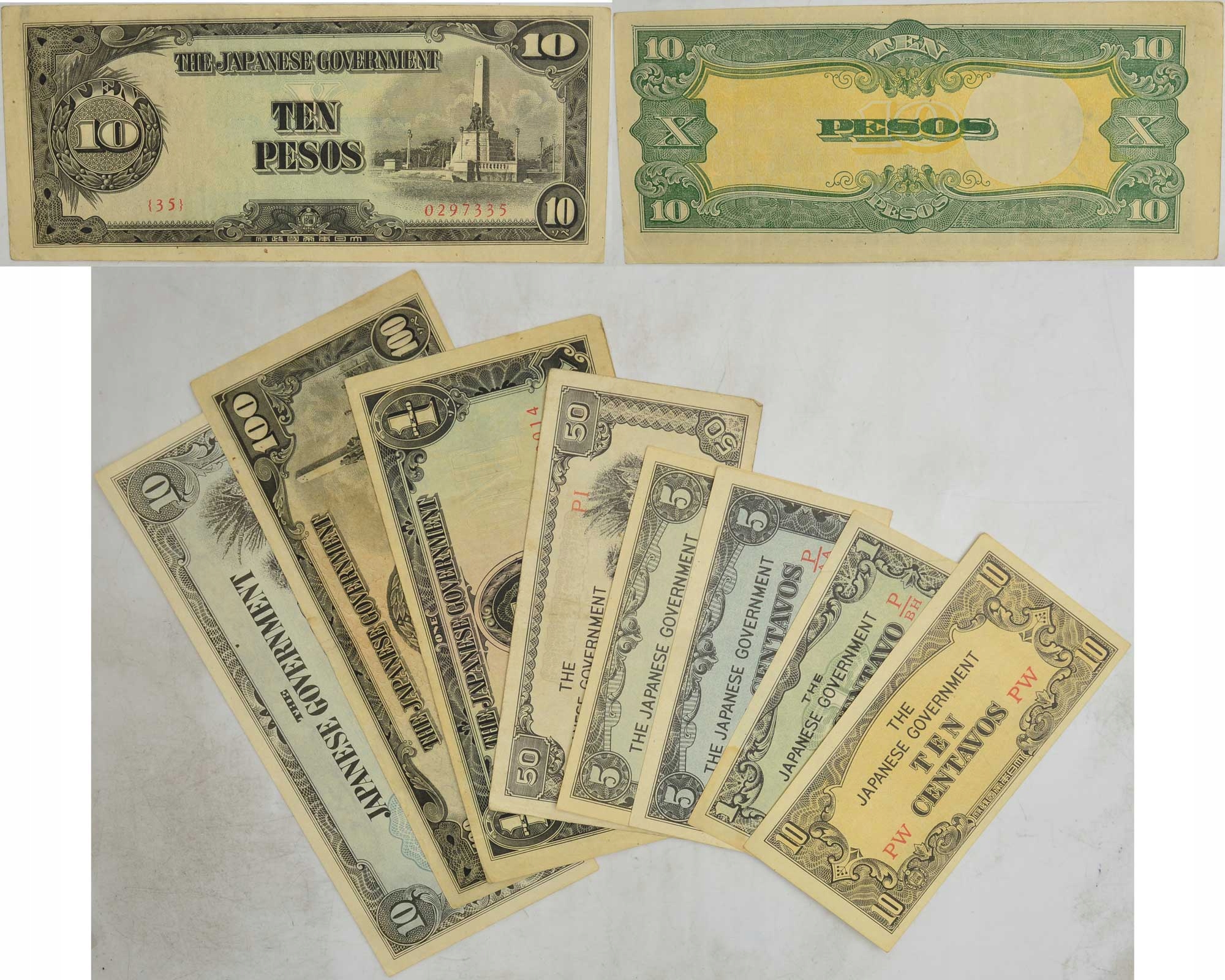 - Опис: у комплекті є банкноти з наступні номінали: 1 сентаво, 5 сентаво (2 штуки, два варіанти), 10 сентаво, 50 сентаво, 1 песо, 5 песо, 10 песо, 100 песо - усі з 1942 по 1945 роки. Банкноти періоду Японії професія .