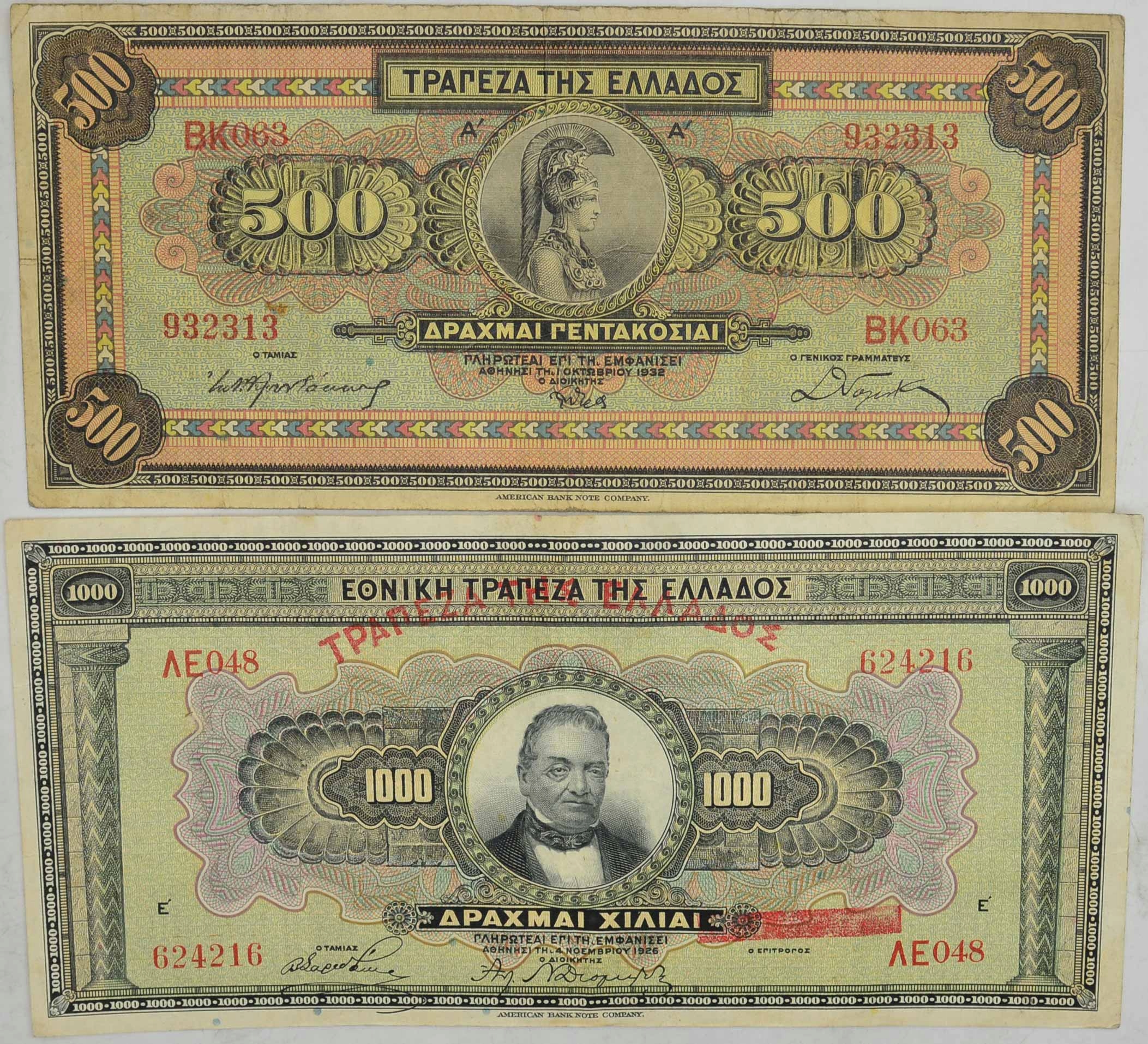 - Опис: Набір містить банкноти номіналом: 500 драхм 1932 р., 1000 драхм 1926 (1928 р.)