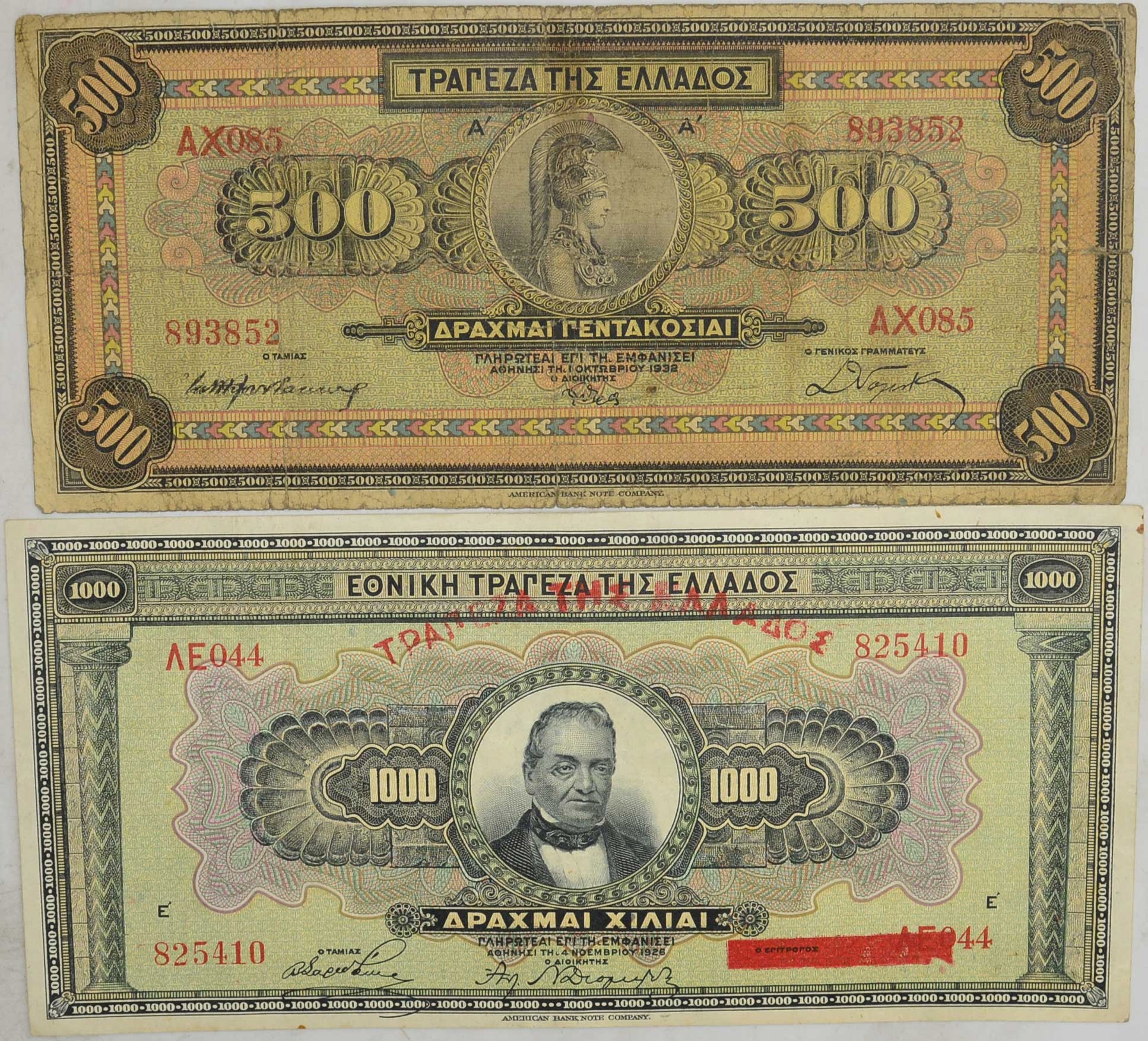 - Опис: Набір містить банкноти номіналом: 500 драхм 1932 р., 1000 драхм 1926 (1928 р.)