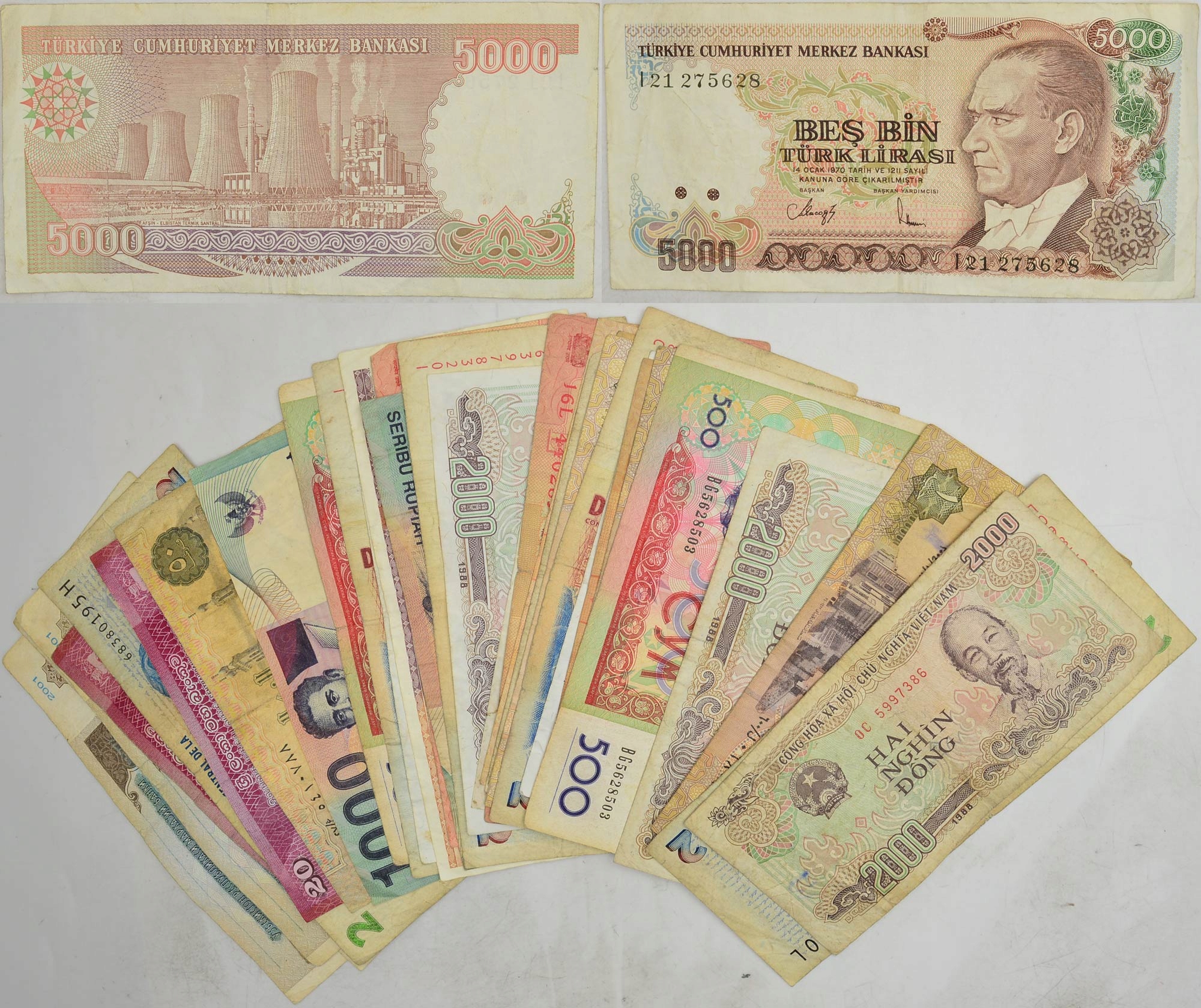 - Опис: У набір входять банкноти різних країн світу з різними датами та номіналами, зокрема: Туреччини, Аргентини, Індонезії
