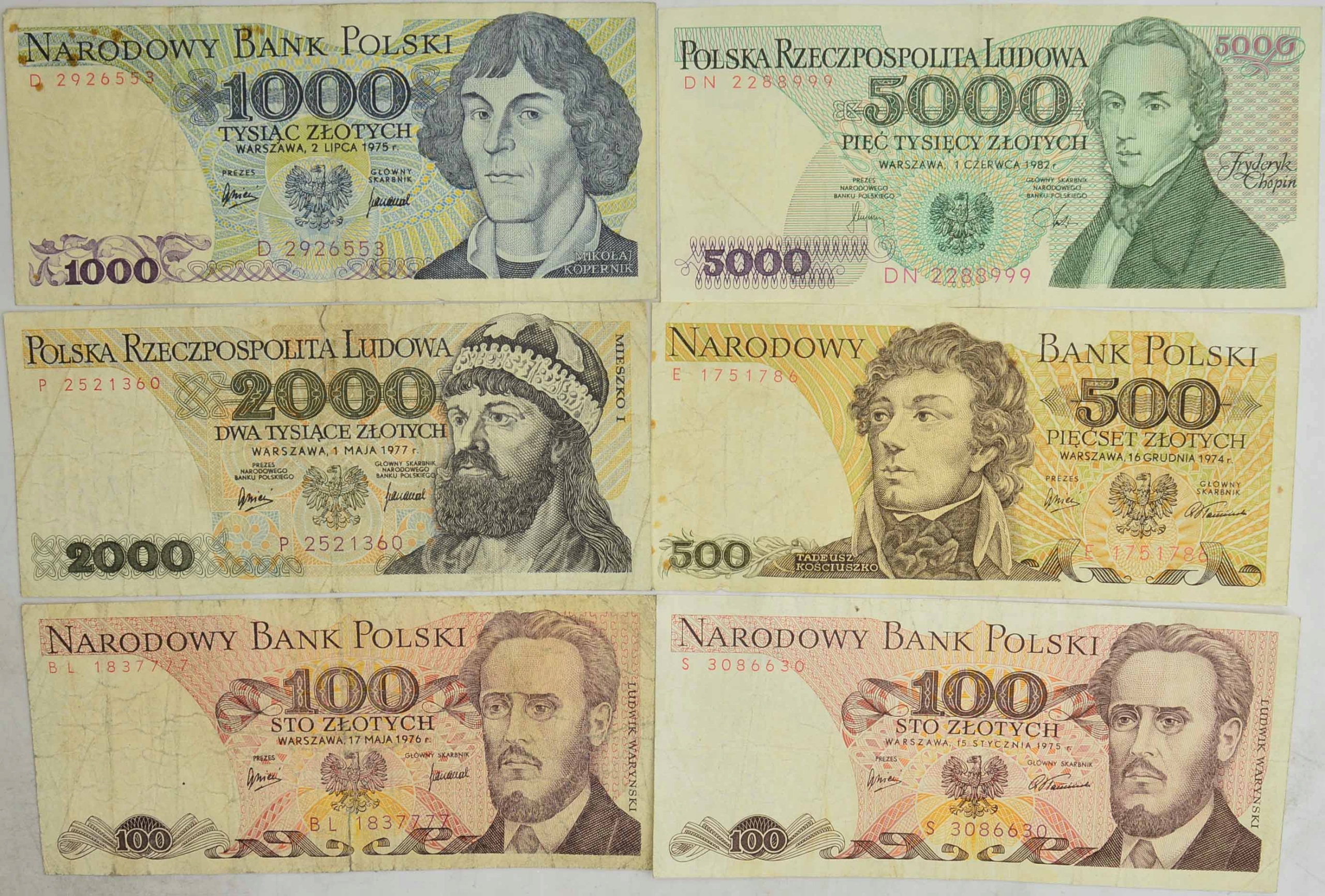 - Опис: У набір входять банкноти з номіналами : 100 PLN 1975 S, 1976 BL, 500 PLN 1974 F, 1000 PLN 1975 D, 2000 PLN 1977 P, 5000 PLN 1982 DN