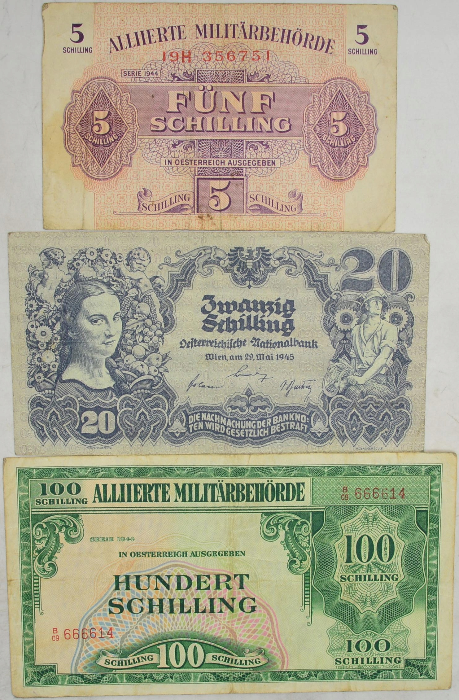 - Опис: У набір входять банкноти номіналів: 5 шилінгів 1944 року, 20 шилінгів 1928 року, 100 шилінгів 1944 року