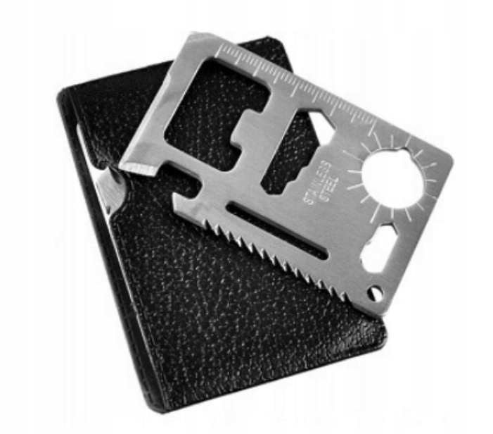 Серед іншого, він був оснащений ножем, відкривачкою для консервів, відкривачкою для пляшок, викруткою, лінійкою, гайковими ключами, пилкою та транспортиром. У комплект входитьчохол чорного кольору. Картка поміщається у ваш гаманець замість платіжних карток.