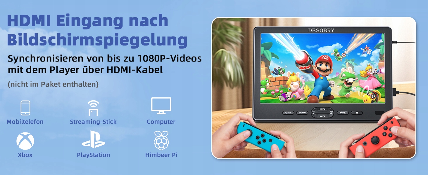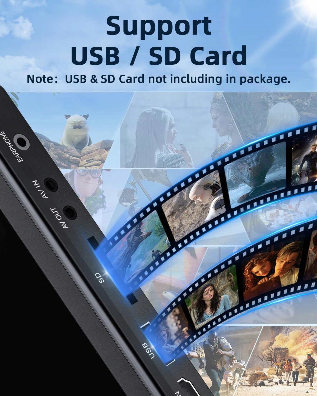 Автомобільний плеєр із входом HDMI дозволяє синхронізувати зображення 1080p із телефону, консолі (PS3/PS4/Xbox) і комп’ютера. Ідеально підходить для ігор і перегляду фільмів під час тривалих подорожей.