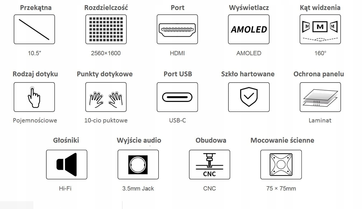 10,5-дюймовий AMOLED-дисплей із портом HDMI, роздільна здатність 2560 x 1600 2K, повністю ламінована панель із загартованого скла.