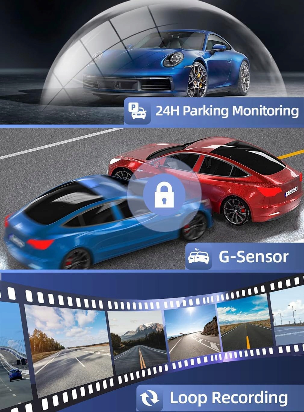 【Контурний запис і G-сенсор】Ви ніколи не пропустите важливий момент. Коли карта пам’яті заповнюється, камера автоматично перезаписує найстаріший файл (циклічний запис). Вбудований G-сенсор миттєво блокує записи зіткнень, щоб запобігти перезапису, зберігаючи ключові докази. Продукт підтримує карти пам’яті об’ємом до 64 ГБ (продаються окремо), що дозволяє довше записувати важливі моменти.