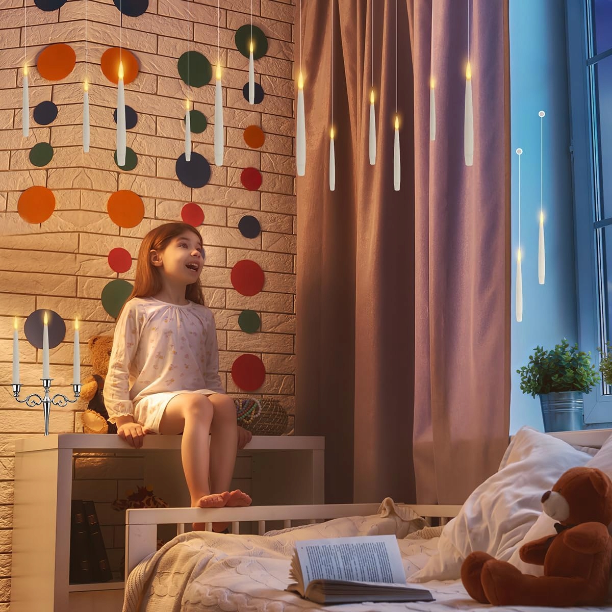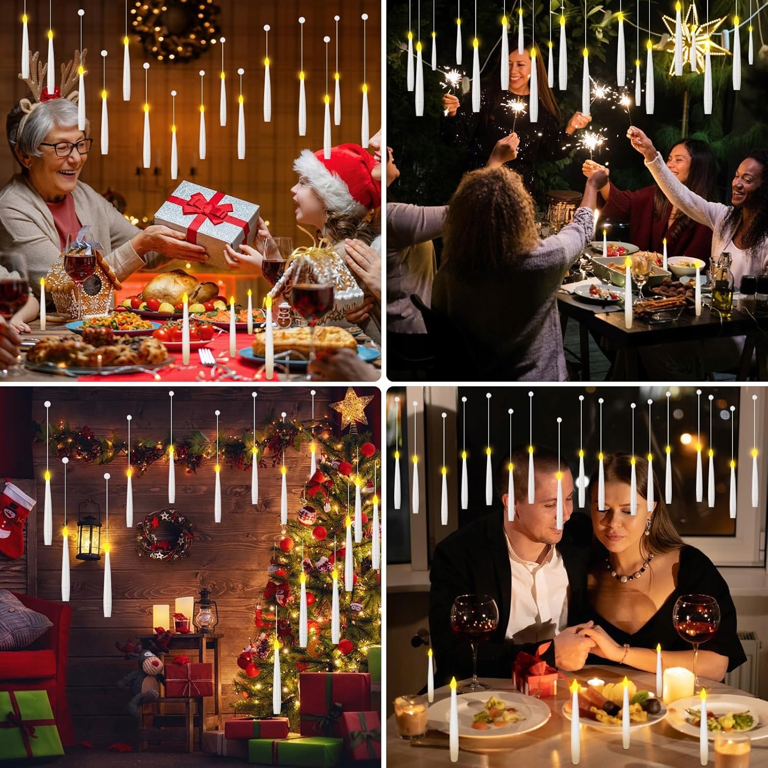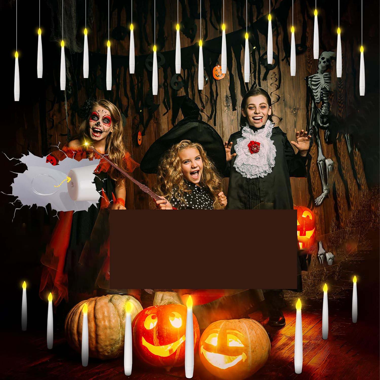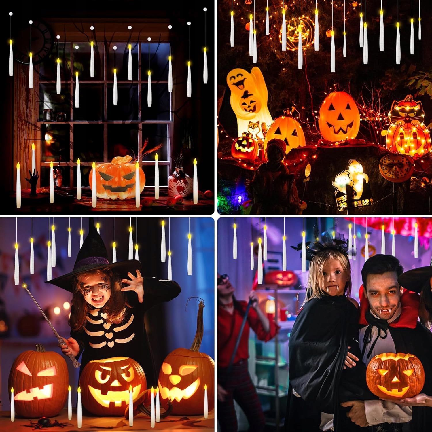 🎨🎨【Підвісні свічки для прикраси дому】. Ці безполум’яні світлодіодні свічки постачаються з 50-метровою волосінню (практично невидимою). Створіть власний чарівний простір на свій смак. Підвісьте ці свічки до стелі або за допомогою гачків прикріпіть їх до вікон, стін або ялинки. Ідеально підходять для декорацій на Хеллоуїн, вони також підходять для камінів, обідніх столів, інтер’єру будинку та відкритих просторів. Чудовий пульт дистанційного керування у формі палички у поєднанні з плаваючими свічками створює чарівну атмосферу.