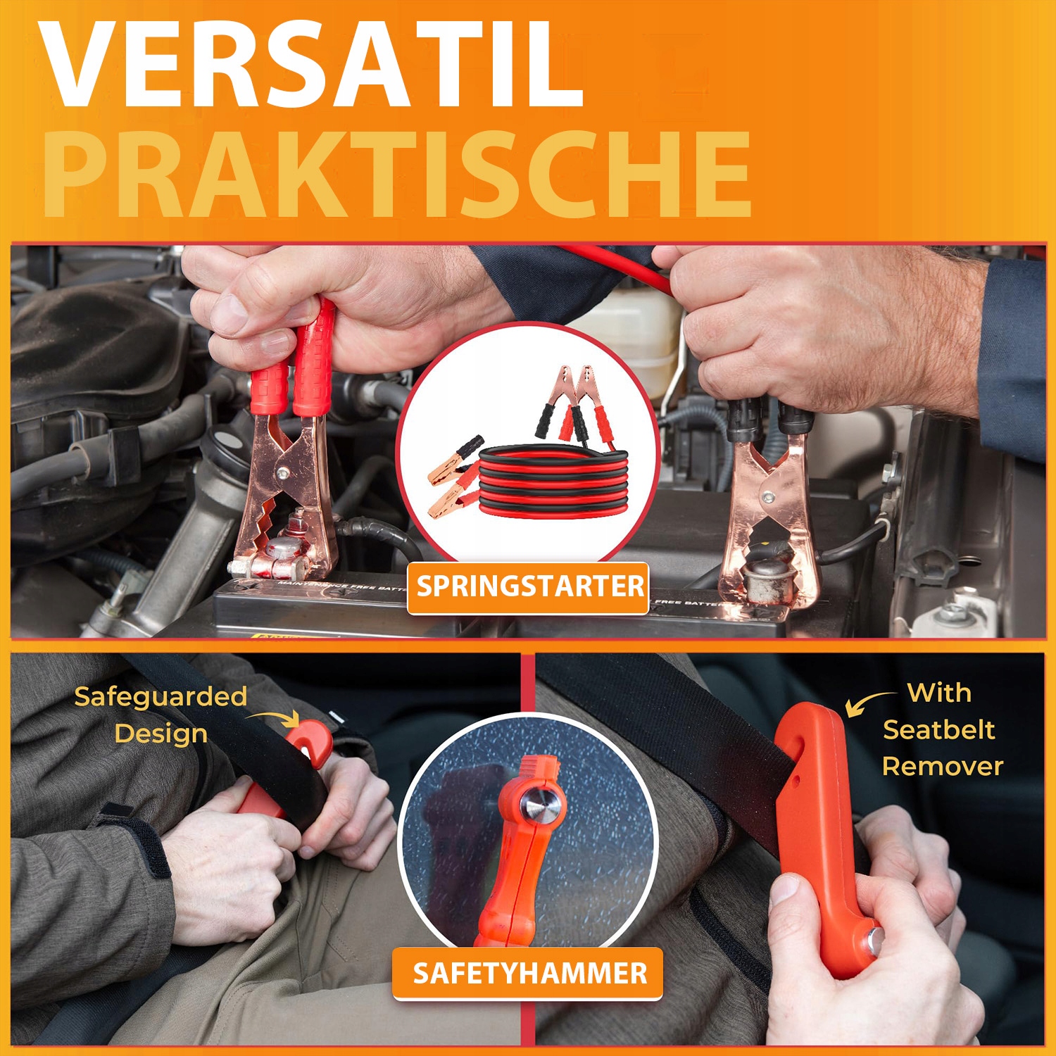 - багатофункціональний аварійний інструмент - автомобіль аварійного автомобіля - це набір 10 за 1, який містить стартові кабелі, буксирування, попереджувальний трикутник, запобіжник, захисний молоток, індикатор аварійного світла, викрутки та рукавички, світловідбиваюча безпека та мішок для зберігання. Прикріплена сумка для зберігання дозволяє легко зберігати аварійні аксесуари, тому їх не можна легко втратити. Він невеликий і компактний, тому його можна зберігати в будь -якій точці багажника, на задньому сидінні або на сховищі шини. Це ідеальний і практичний подарунок для родини та друзів.