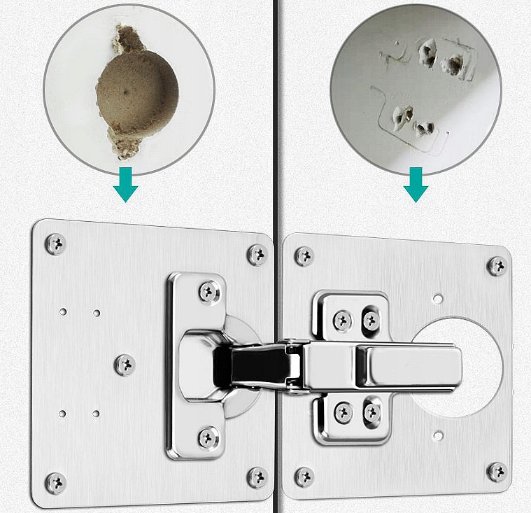 Універсальна ремонтна пластина для зламаної меблевої петлі. Завдяки численним отворам вона підійде до більшості петель та меблів.