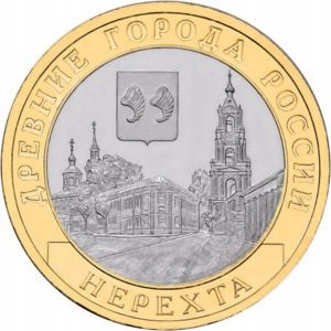 Реверс: архітектурна панорама міста, вгорі - герб Нерехти, на кільці по краю написи - вгорі: «ДРЕВНИЕ ГОРОДА РОССИИ», внизу: «НЕРЕХТА». " (Нерехта).