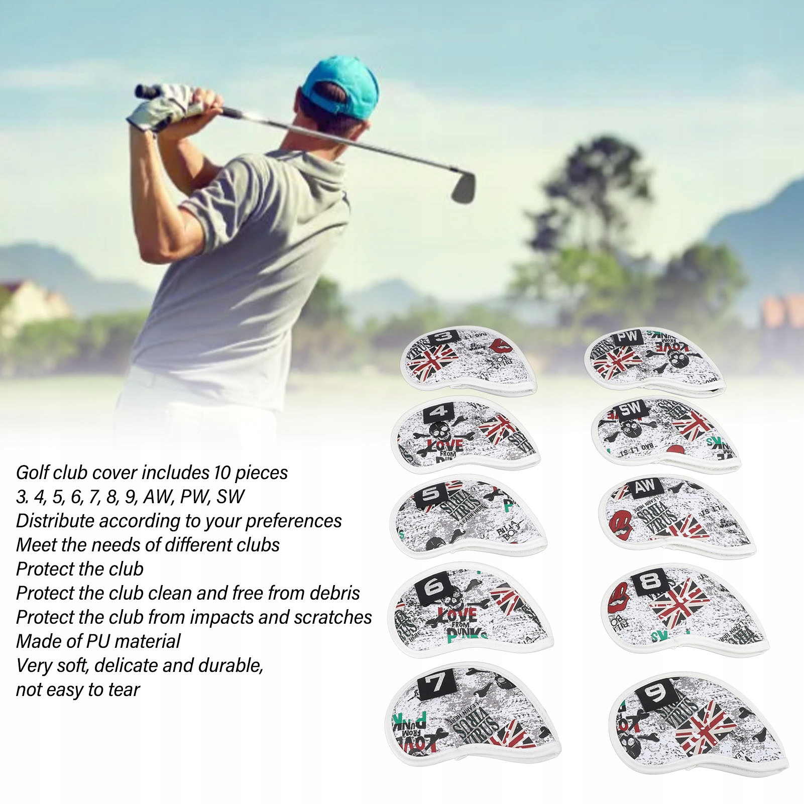 2. Повний набір: набір чохлів для ключок для гольфу включає 10 предметів (3, 4, 5, 6, 7, 8, 9, aw, pW, SW), які можна розподілити відповідно до ваших уподобань для задоволення потреб різних ключок.